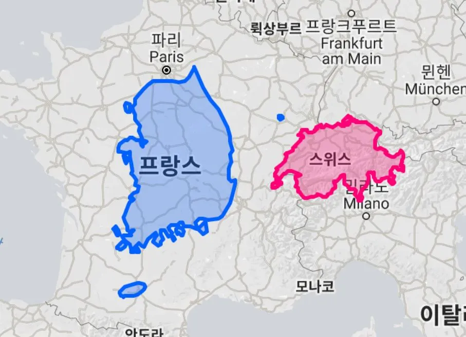 실제 스위스 지도 / 우리나라와의 비교 이미지 (※ 비교이미지는 뽀로로친구에디 티스토리에서 가져왔습니다.)