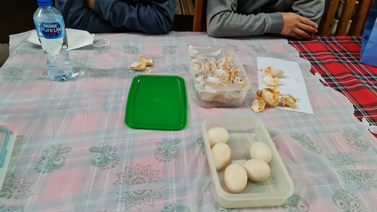 미리 싸온 유부초밥과 구운계란으로 아침 요기. 여기에 파키스탄 전통요리인 "난"과 "짜이"를 곁들임
