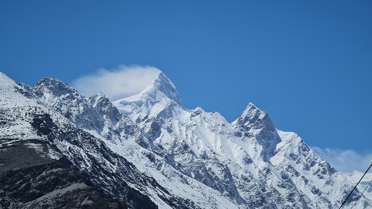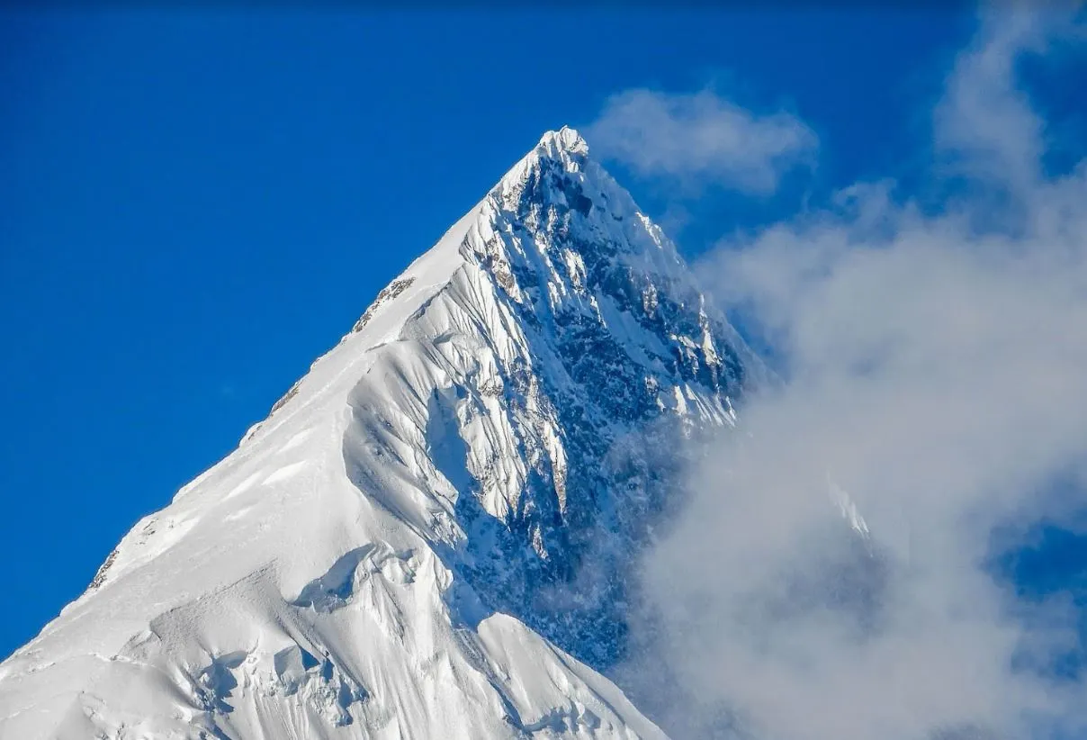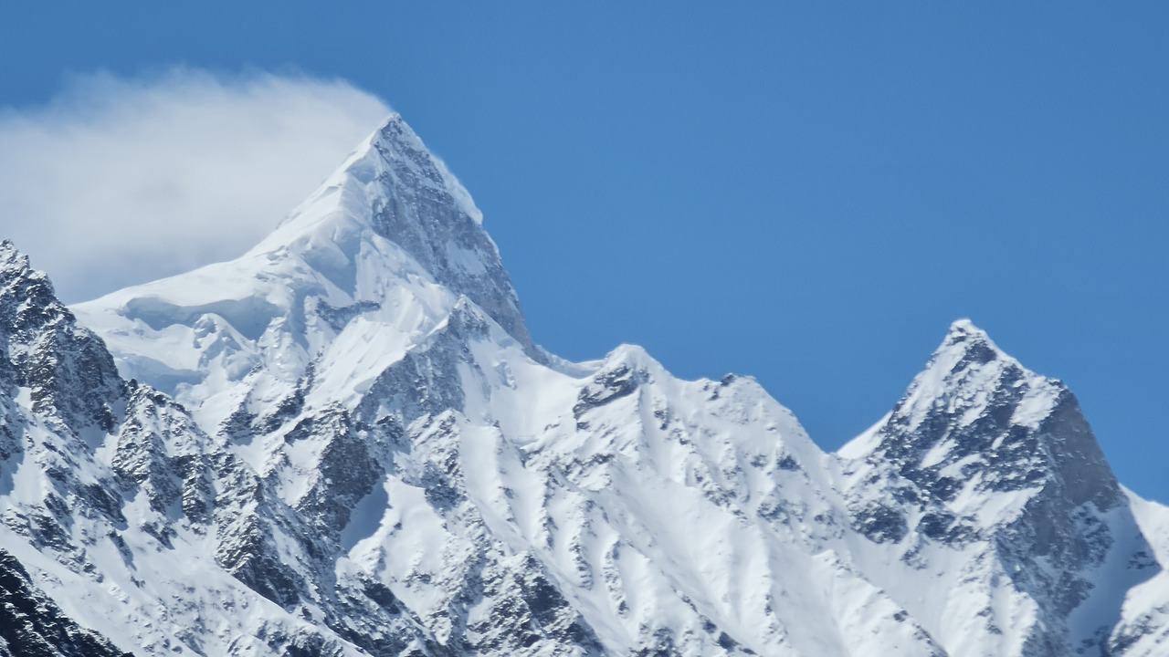 Passu Peak는 눈보라 치는 왼쪽 빙식침봉이 아니라, 오른쪽의 완만한 모양의 큰 봉우리다. Passu 빙하와 일직선으로 연결되어 있다.