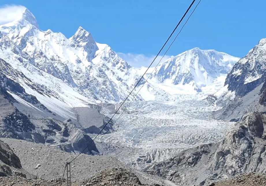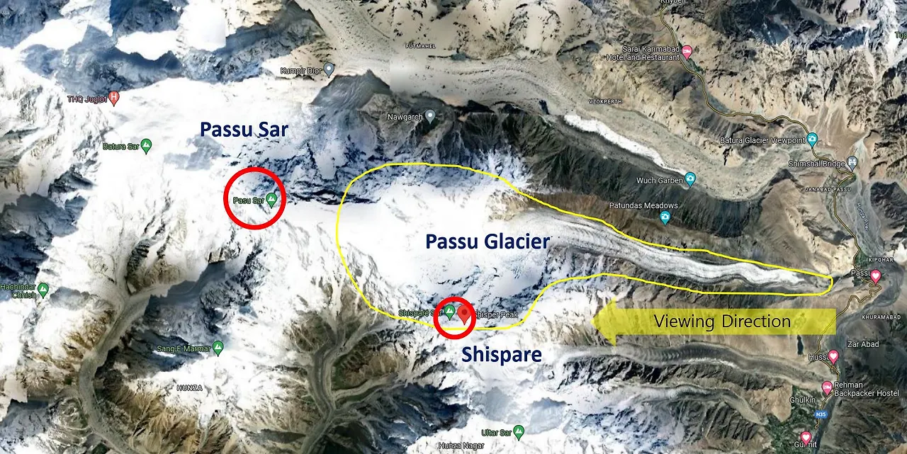 파수 빙하는 길이가 20.5㎞이고 면적이 115㎢에 걸쳐 있습니다. 맨 끝에 보이는 봉우리는 7,478m(24,534ft) 높이의 Passu Peak입니다. 1978년 파키스탄-일본 육군 합동 원정대의 일원이었던 캡틴 셰르 칸(이후 대령)이 처음 등정했습니다.