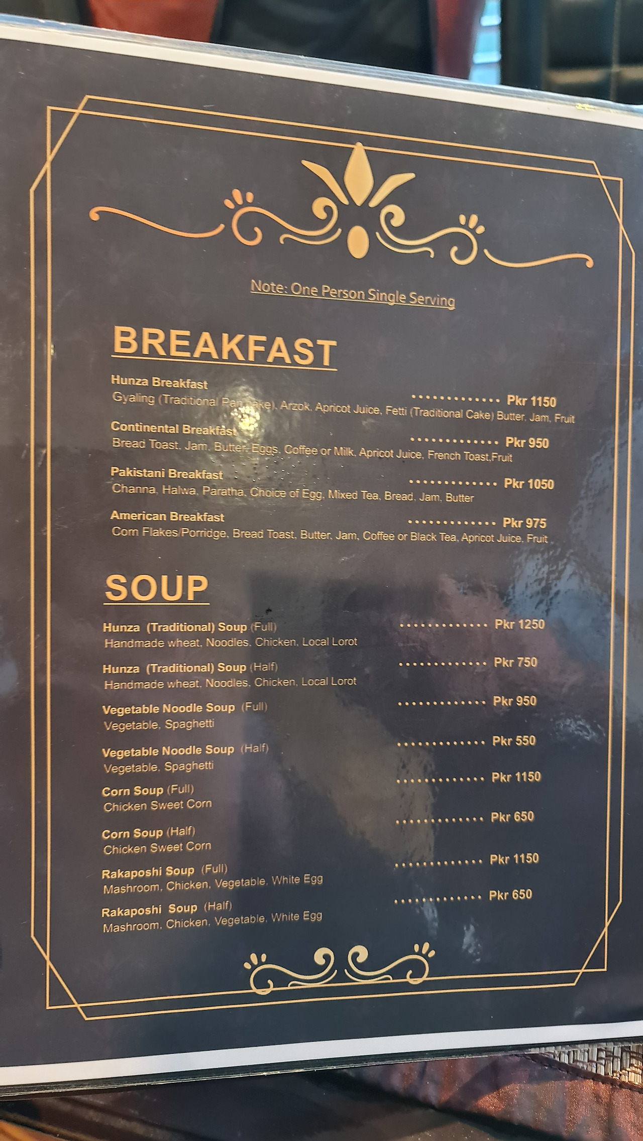 - 훈자 전통 수프, 머튼 카라히, 짜파티 롤, 치킨 한디, 모로칸 스테이크
