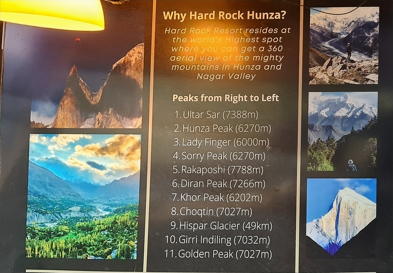 주변을 둘러보면 10대 고봉을 볼 수 있다고 하는데, 내가 위치를 아는 건 Lady's Finger와 Golden Peak 밖에 모르겠다. 여기서도 라카포시가 보이나 본데, 어디 있는지 찾아보진 못했다.
