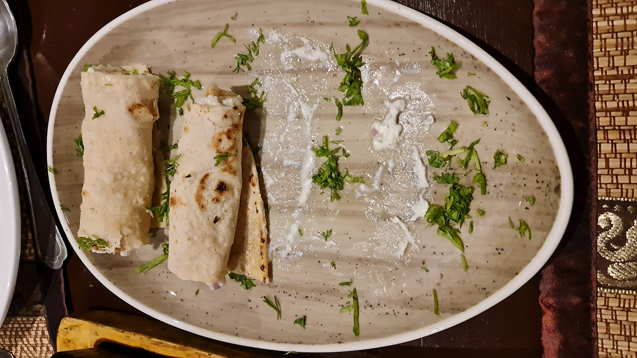 내가 시킨 메뉴가 아니라서 저게 뭐였더라 한참을 찾아봤다. 이건 심지어 구글 이미지에도 안 나오는 초 레어템. 인도/파키스탄 기본 주식인 짜파티에 훈자식 치즈와 다진 양파 등 야채를 돌돌 말거나 끼워 먹는 음식. 시큼하고 담백한 플레인 치즈빵 같은 맛. 달거나 기름지지 않아서, 보이는 것처럼 건강한 맛이 난다.