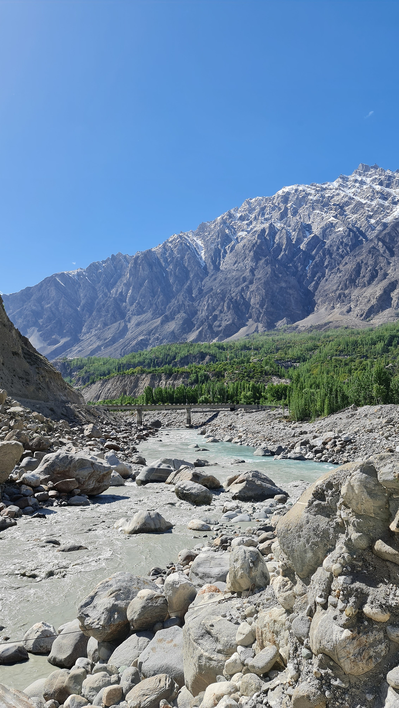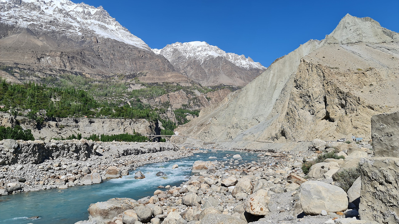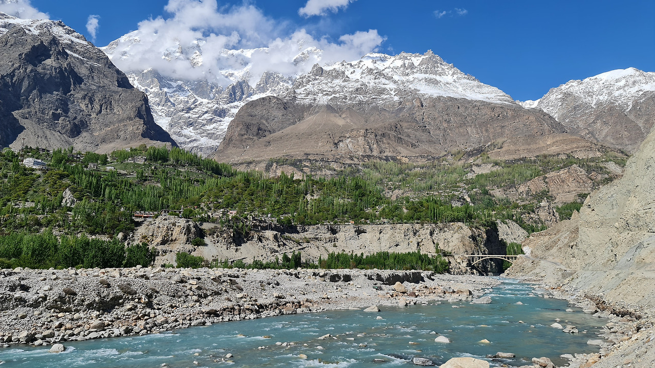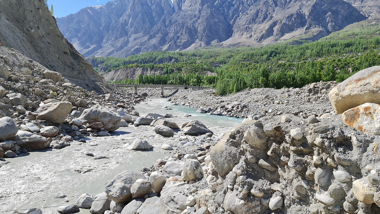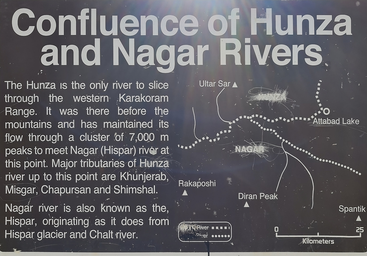 Hunza강은 서쪽 Karakoram Range를 가로지르는 유일한 강입니다. 그것은 산 이전부터 있었고 이 지점에서 Nagar(Hispar)강을 만나기 위해 약 7,000m 높이 산봉우리들 사이로 흘러왔습니다. 지금까지 Hunza강의 주요 지류는 Khunjerab, Misgar, Chapursan 및 Shimshal입니다.