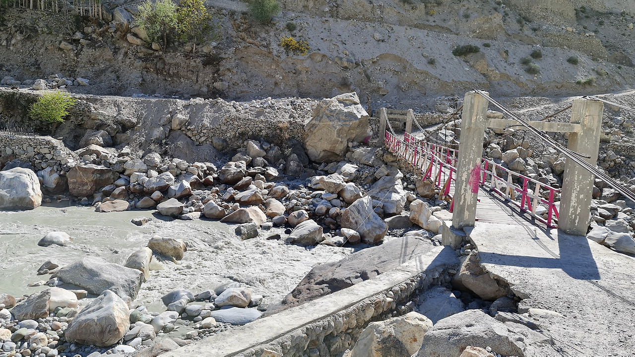 텐트가 늘어선 삼각주를 가로질러 건너가 보면 이렇게 훈자강과 나가르강이 만나는 포인트에 낡은 도보다리가 나온다. 강물이 섞이는 광경. 나가르강은 블랙워터인데, 훈자강은 에메랄드워터로 강물이 섞이는 광경도 장관을 이룬다.