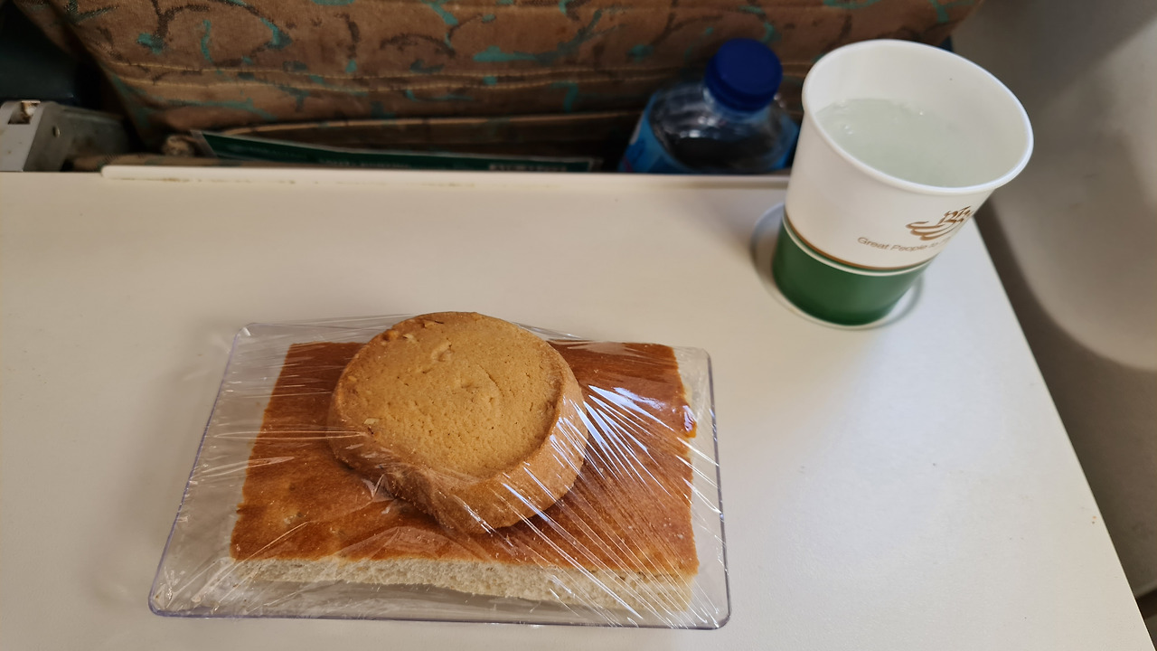 투박해 보이는 쿠키와 샌드위치. 물, 콜라, 사이다 및 기타 과일주스 중 취향껏 제공해 준다. 스튜어디스는 파키스탄 느낌의 전통복의 특징을 살린 승무원복을 입고 마스크를 착용하고 서빙을 해 주셨다. 쿠키와 샌드위치는 탑승객에게 인기가 별로 없었는데(안 먹겠다고 안 받는 사람이 태반) 의외로 담백하고 고소하고 무척 맛있었다. 내 옆자리 승객도 안 받던데, 내가 대신 받아서 먹을 걸 그랬나 살짝 후회가...