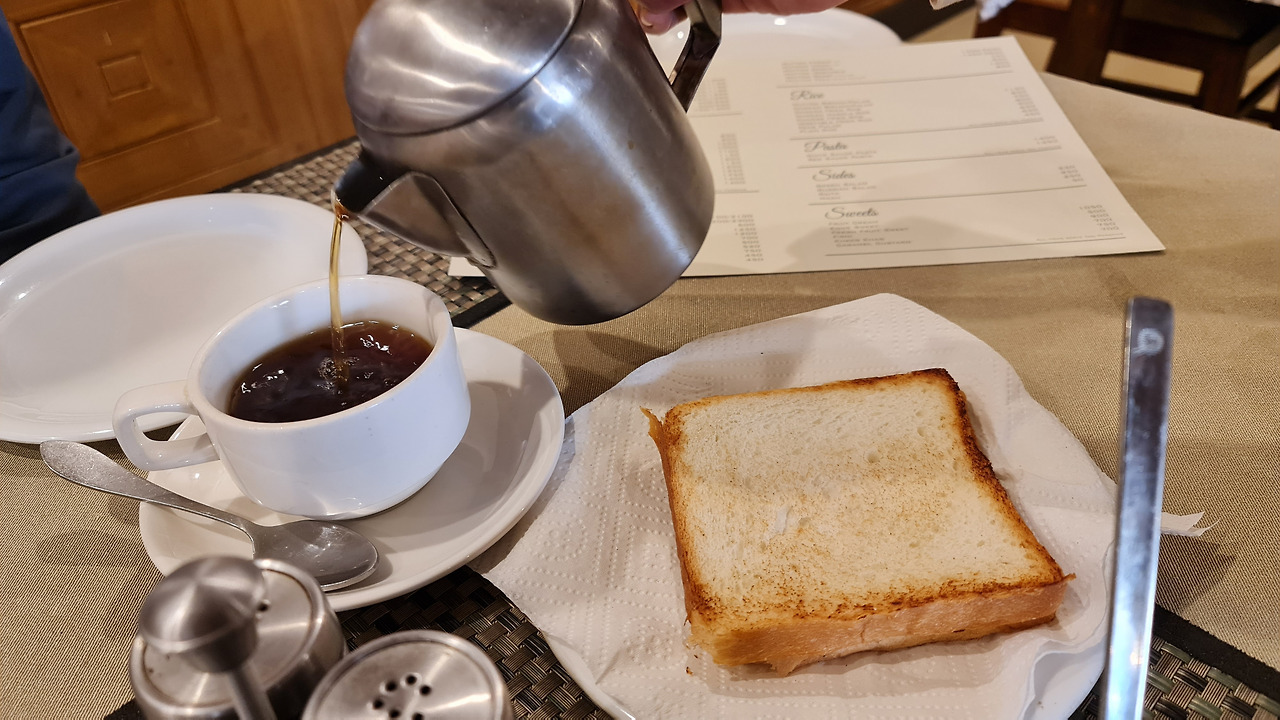 녹차 80루피(400원), 오믈렛 200루피(1,000원), 토스트 2장 60루피(300원). 숙박료에 조식값은 포함되어 있진 않지만 3성 호텔급의 깨끗한 식당치곤 매우 매우 저렴한 편이니 만족. 대신, 어딜 가도 커피는 비싸다. 280루피(1,400원)나 한다. 서민들은 짜이를 마시지 커피를 거의 안 마시는 이유이다.