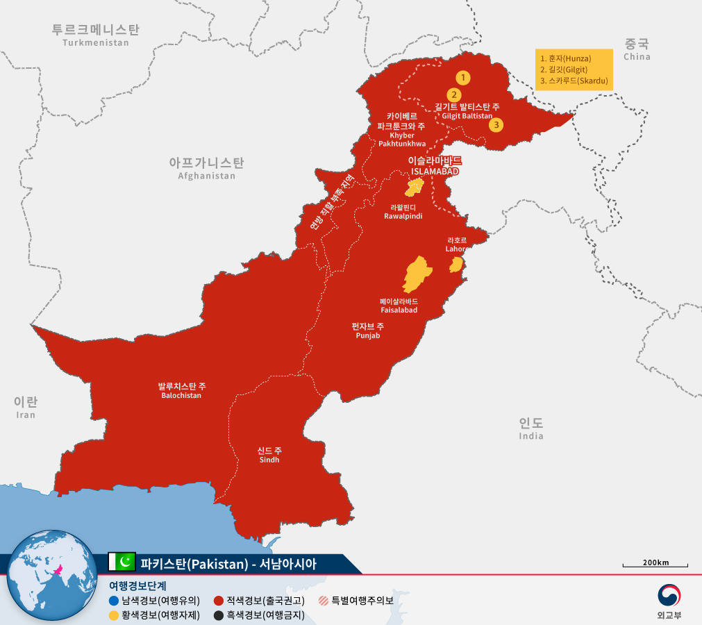 - 길깃 발티스탄 주에서 테러가 나는 경우는 매우 드물어요(아예 없진 않습니다만...). 산악 트레킹 하러 온 외국인을 대상으로 총격테러가 있긴 했었는데 좀 지난 이야기고 훈자와 길깃, 스카르두 지역만큼은 비교적 안전하다고 알려진 지역입니다. 외교부 해외안전여행 여행경보지도를 살펴보면, 파키스탄 전역이 "적색경보", 즉 출국을 권고하는 지역인데 길깃 발티스탄 주의 딱 세 곳(훈자, 길깃, 스카르두) 지역만 "황색경보"-여행자제 지역으로 설정되어 있습니다. 그러니까, 다른 파키스탄 지역 대비 "상대적으로" 안전하단 얘기지, 여전히 안심하고 갈 수 있는 곳은 아니긴 해요.