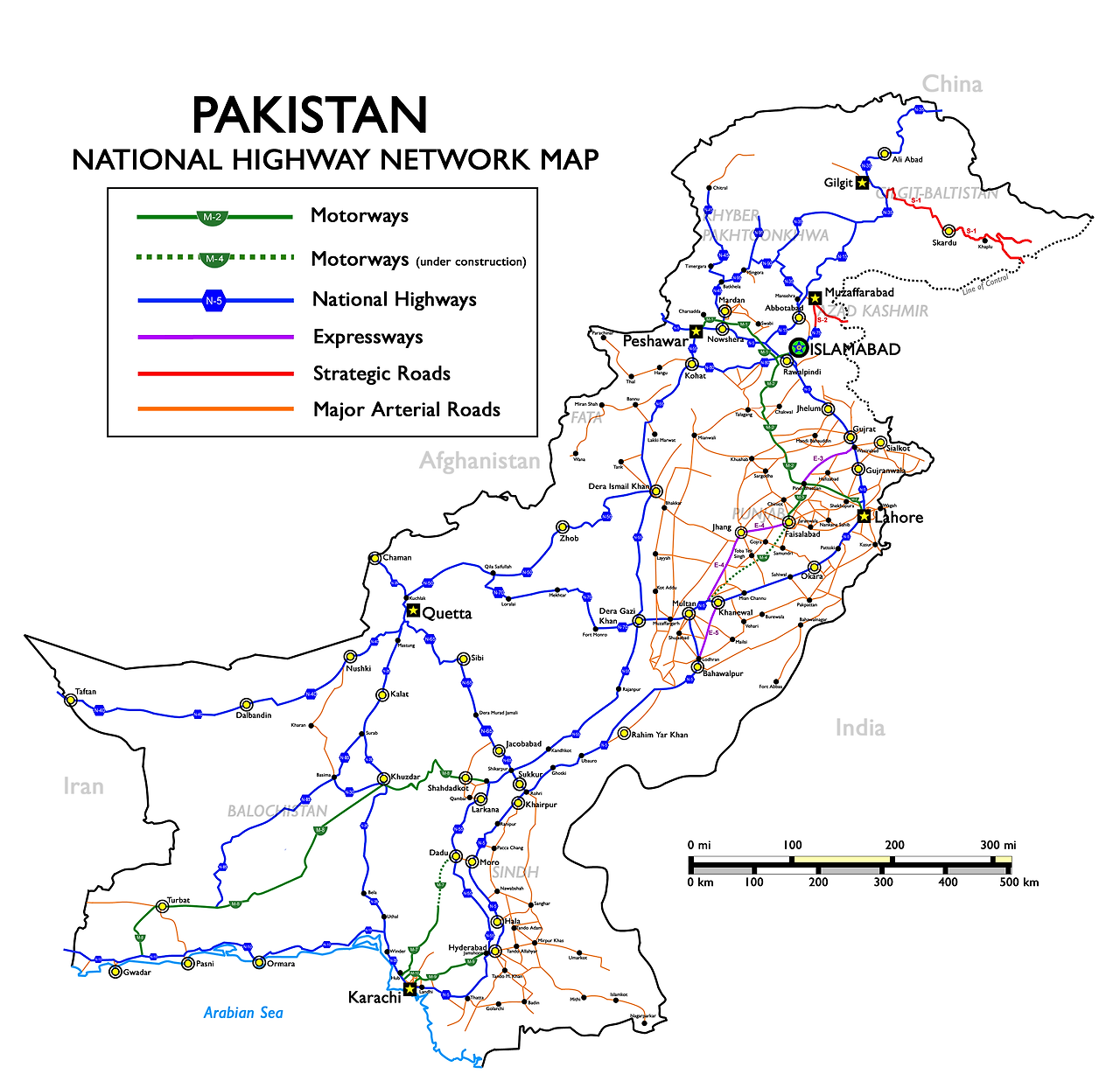 파키스탄에는 총 14 노선의 모터웨이가 있다. 신호등 막힘 없이 100km 이상의 속력으로 달릴 수 있는 "고속도로"의 느낌이 모터웨이이며, 흔히 고속도로로 번역되는 "하이웨이"는 한국에서의 지방 국도보다 못한 실정이니 파키스탄에서 "하이웨이"라고 고속도로 상태를 상상하면 곤란하겠다.