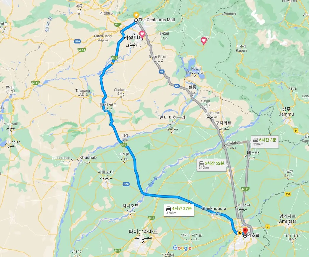 지사에서 바로 가는 길이 직선거리는 더 가깝긴 한데, 길 상태가 좋지 않아서 한국식 고속도로, 즉 모터웨이가 잘 되어있는 이슬라마바드와 라호르를 잇는 M-2 도로를 이용하기로 했다.