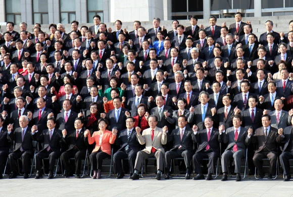 제19대 국회의원 단체 기념촬영. 정장에 타이를 메지 않은 남성분은 단 한 명도 없다.