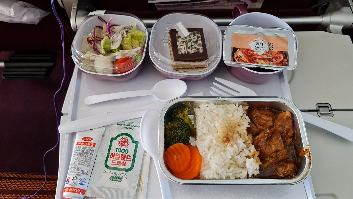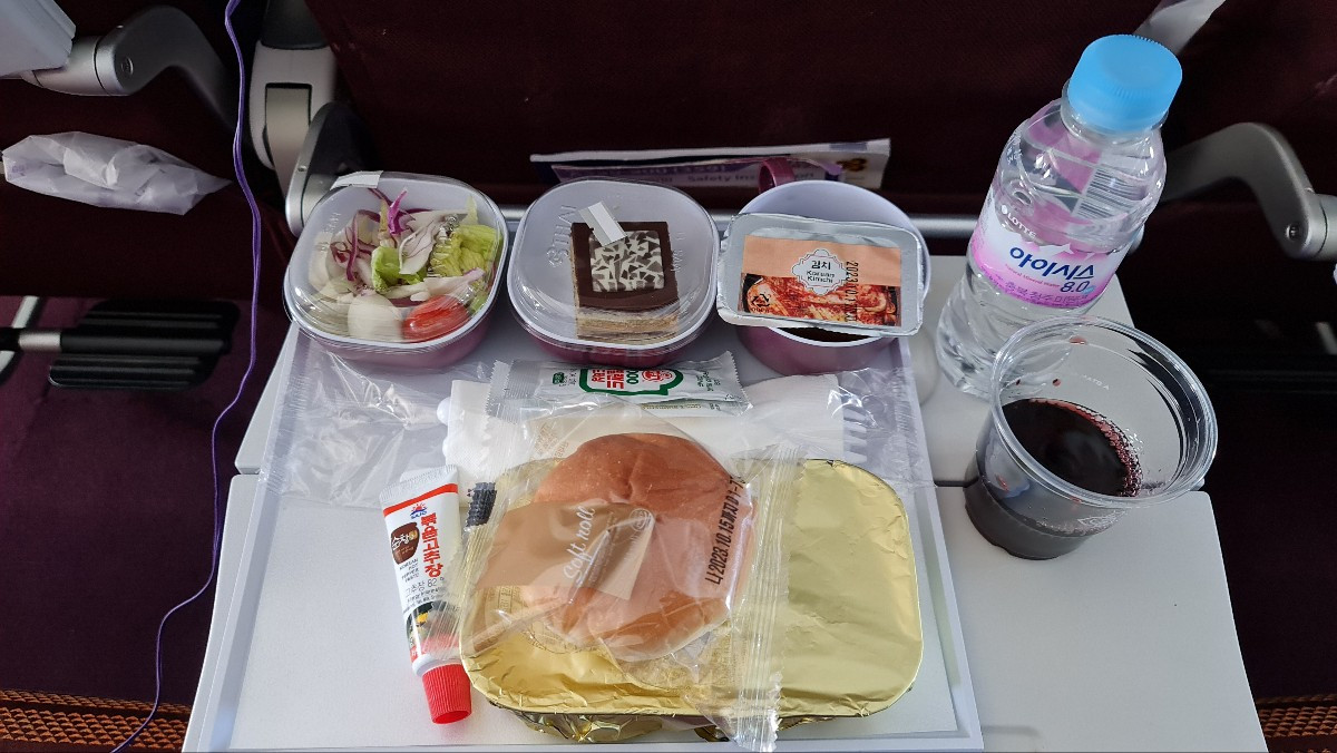 요번에 고른 기내식은 쌀밥에 새우요리. 정확히 묘사하기가 좀 어렵지만 단짠 소스로 요리된, 한국인 입맛에 잘 맞는 요리여서 만족스러웠다. 역시 곁들인 음료는 레드와인. 아, 이걸 끝으로 당분간 또 못 마시겠군. 아쉽다.