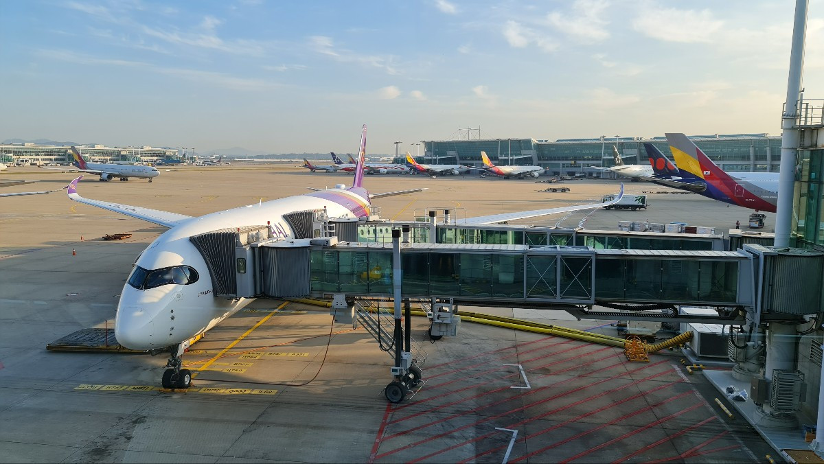 인천공항 아침 풍경과 내가 타고 갈 타이항공 비행기. 한국의 가을날은 청명하다. 하늘 색깔이 저래야지.