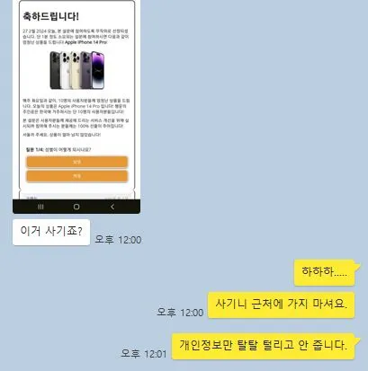요즘 세상에 이런 허술한 낚시에 누가 당하나 싶겠지만, 이런 게 사회 물정 잘 모르는 중고등학생들이 자주 드나드는 사이트에도 노출되어 있다는 게 문제다. 사회생활을 좀 해 본 사람들이라면 직감적으로 이상함을 느끼겠지만, 평소 아이폰이 간절했지만 가지지 못했던 아이들이 이런 피싱창을 딱 만나면 혹할 수밖에 없을 것 같다.
