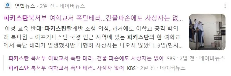 사실, 한국인들에게 파키스탄 테러 소식이 무슨 의미가 있겠냐마는, 그래도 국제 단신을 전하더라도 좀 성의가 있었으면 좋겠다. 여학교 건물 파손 테러 소식을 전하면, 테러로 학교가 얼마나 파괴되었을지 사진자료로 보여주는 것이 제일 우선 아닐까? 국내에 보도된 뉴스는 연합, SBS, KBS 세 곳의 언론사인데, 학교 건물이 얼마나 파괴되었는지 보여주는 언론은 단 하나도 없다. 단신 담당 기자는 뉴스를 전달하며 궁금하진 않았을까? 물론, 해외 언론을 통한 사진의 판권을 다시 사들여 재배부하는 일은 저작권을 지켜가며 일하기 쉽지 않은 일이며, 그래서 미리 계약된 연합뉴스 자료 또는 특파원 자료를 쓸 수밖에 없는 사정을 모르는 바는 아니지만, 그럼에도 너무 성의가 없다는 생각은 과한 게 아닌 것 같다. 별 쓰잘데기 없는 중국뉴스는 잘도 퍼 나르지 않는가 말이다.