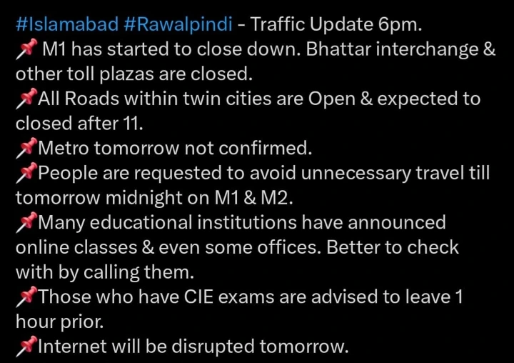 "금요일 늦은 밤, 10월 5일(오늘)부터 수도를 확보하기 위해 군이 배치된다는 소식이 전해진 후 라왈핀디 도로에서도 군용 차량이 목격되었습니다. - DAWN 뉴스 인용 -"