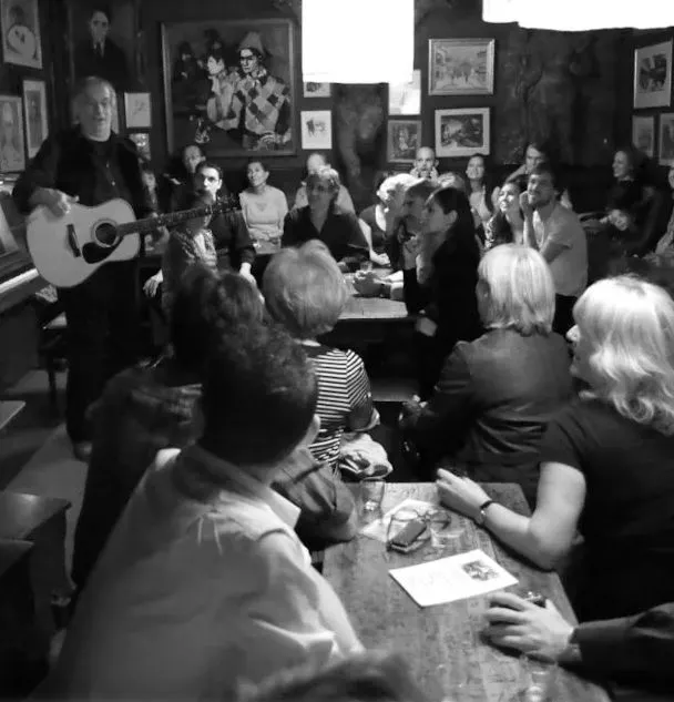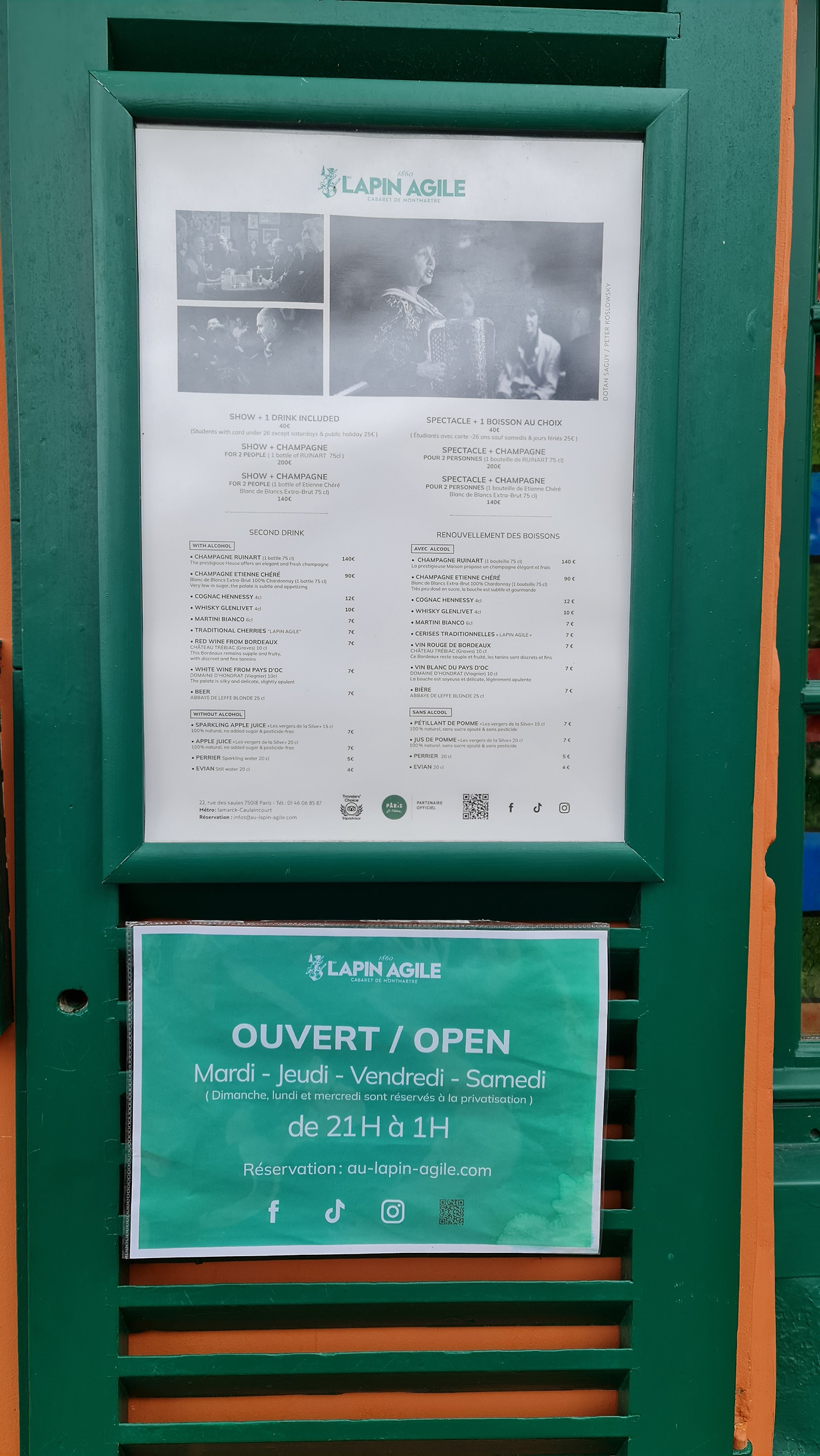 물랭 루주처럼 대규모 무대와 연회장을 갖춘 곳도 카바레지만, 'Cabaret Au Lapin Agile'이 집은 별도의 무대 없이 선술집에 통기타 형식의 소규모 무대인가 봅니다. 연주자와 관객의 거리가 매우 가깝고 소통하는 공연인가 봐요.