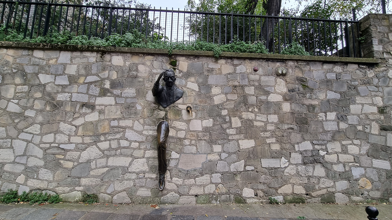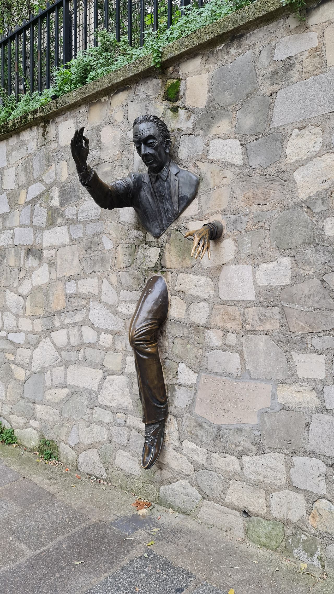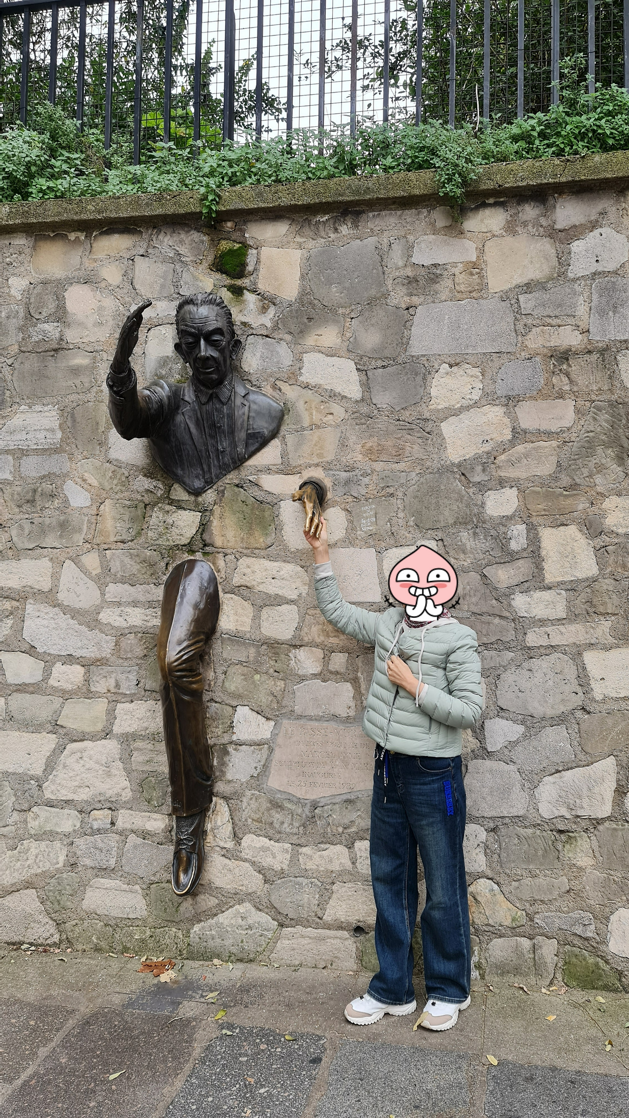 이것은 프랑스 작가 '마르셀 에메'의 소설에 등장하는 '벽에 갇힌 남자'를 표현한 조각입니다.