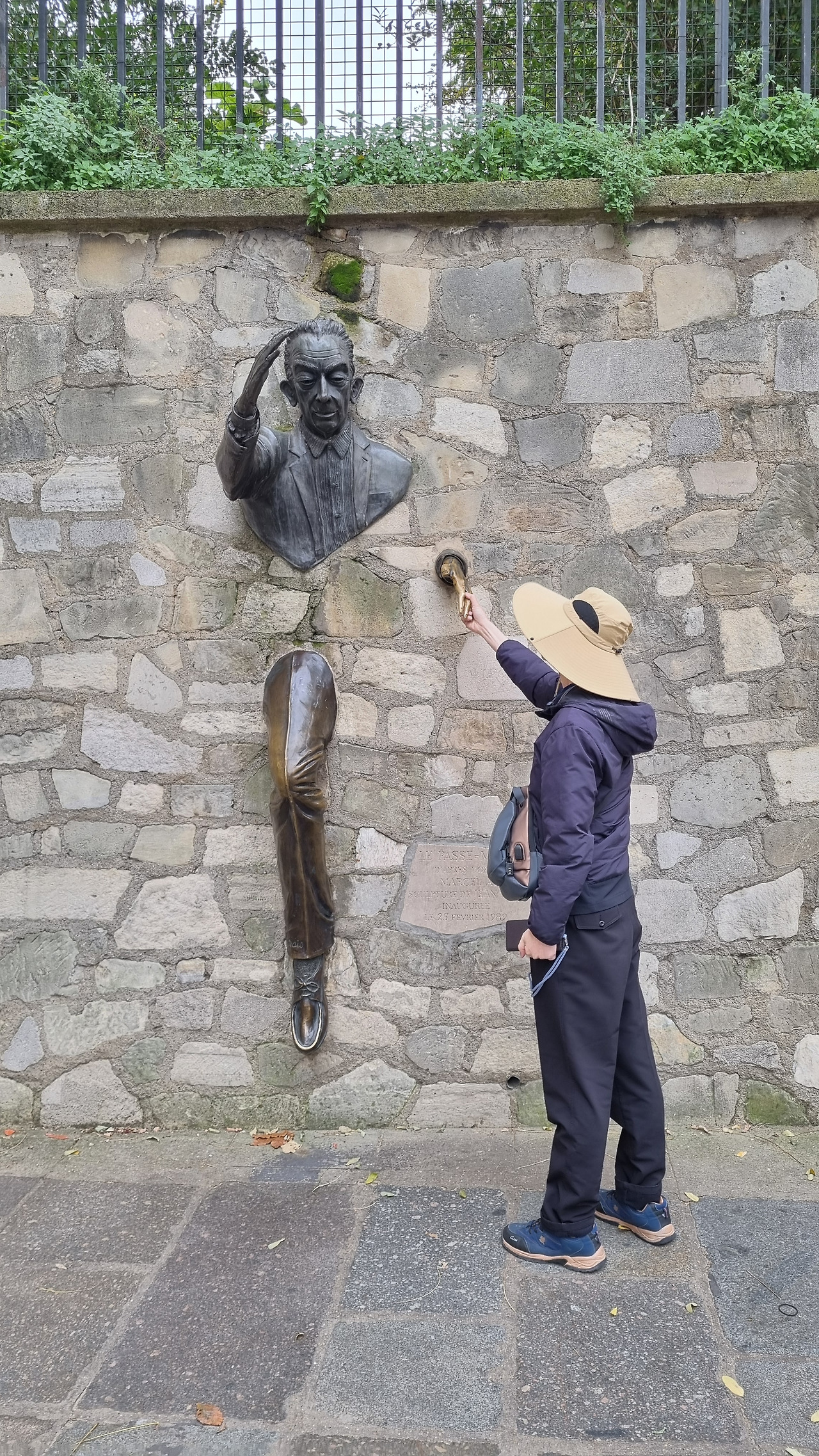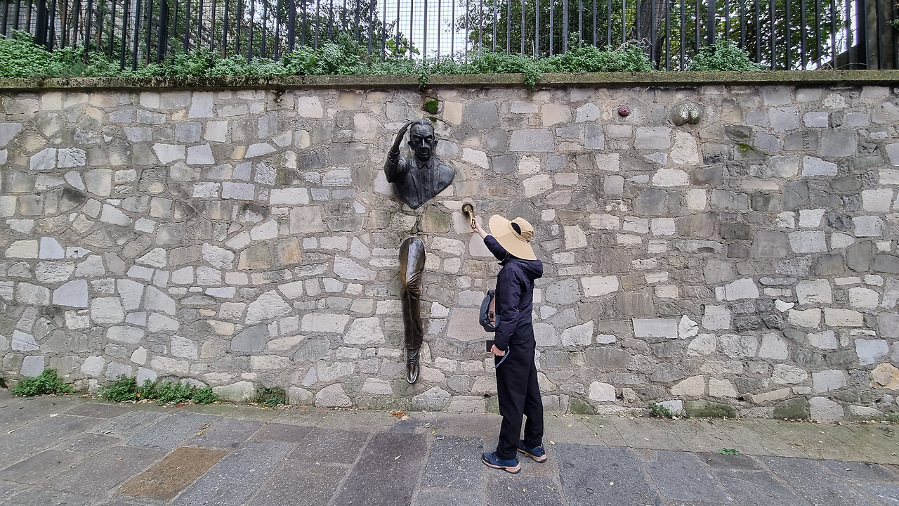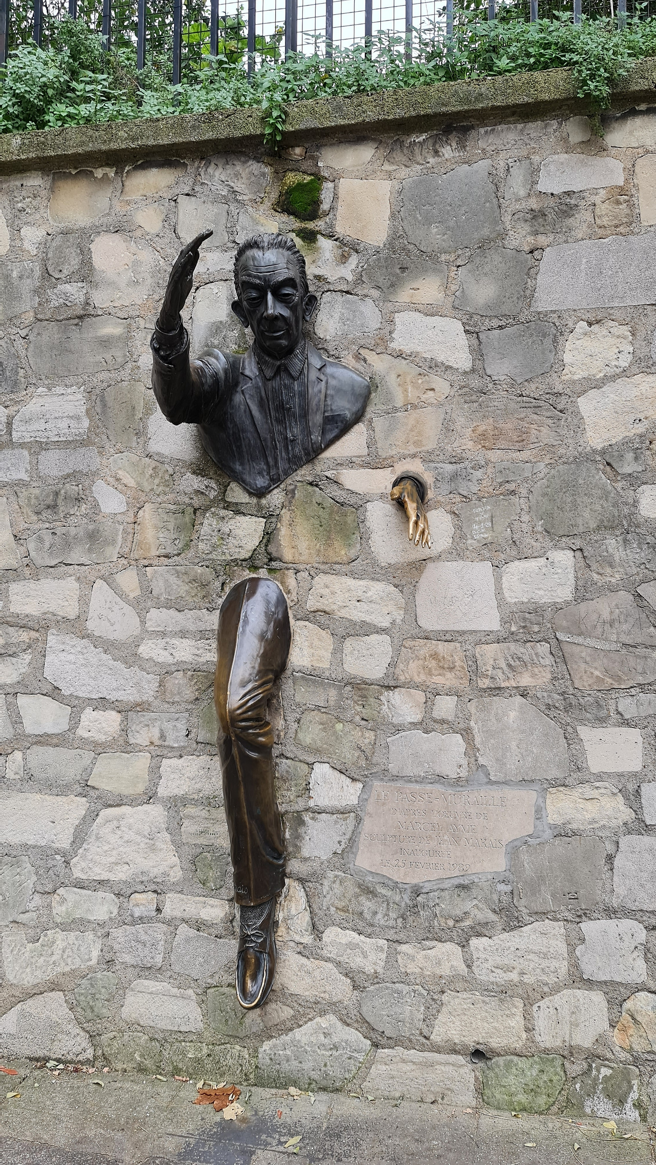 이것은 프랑스 작가 '마르셀 에메'의 소설에 등장하는 '벽에 갇힌 남자'를 표현한 조각입니다.