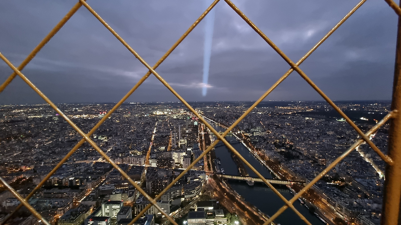 하늘에 아까부터 보이는 길다란 광선은 에펠탑 옥상에서 쏘는 빔입니다. 360도 빙빙 돌아가네요.