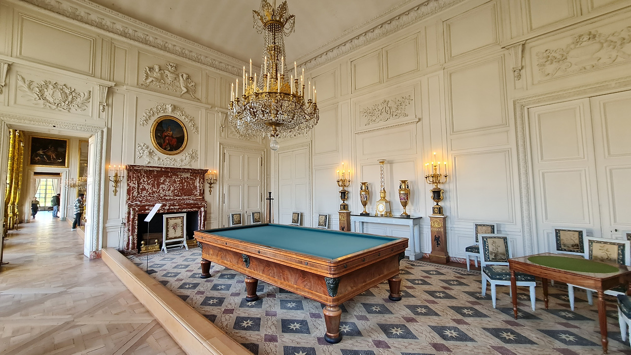 방 중앙에 있는 호화로운 마호가니로 덮인 당구대는 트리아농이 사람들이 즐겁게 놀기를 좋아하는 곳이었다는 것을 상기시켜 줍니다. 루이 14세는 뛰어난 선수였던 듯합니다. 하지만 그의 시대에는 이 방에서 그런 산만함이 일어나지 않았을 것이고, 특히 이 테이블에서는 더더욱 그럴 리가 없습니다.