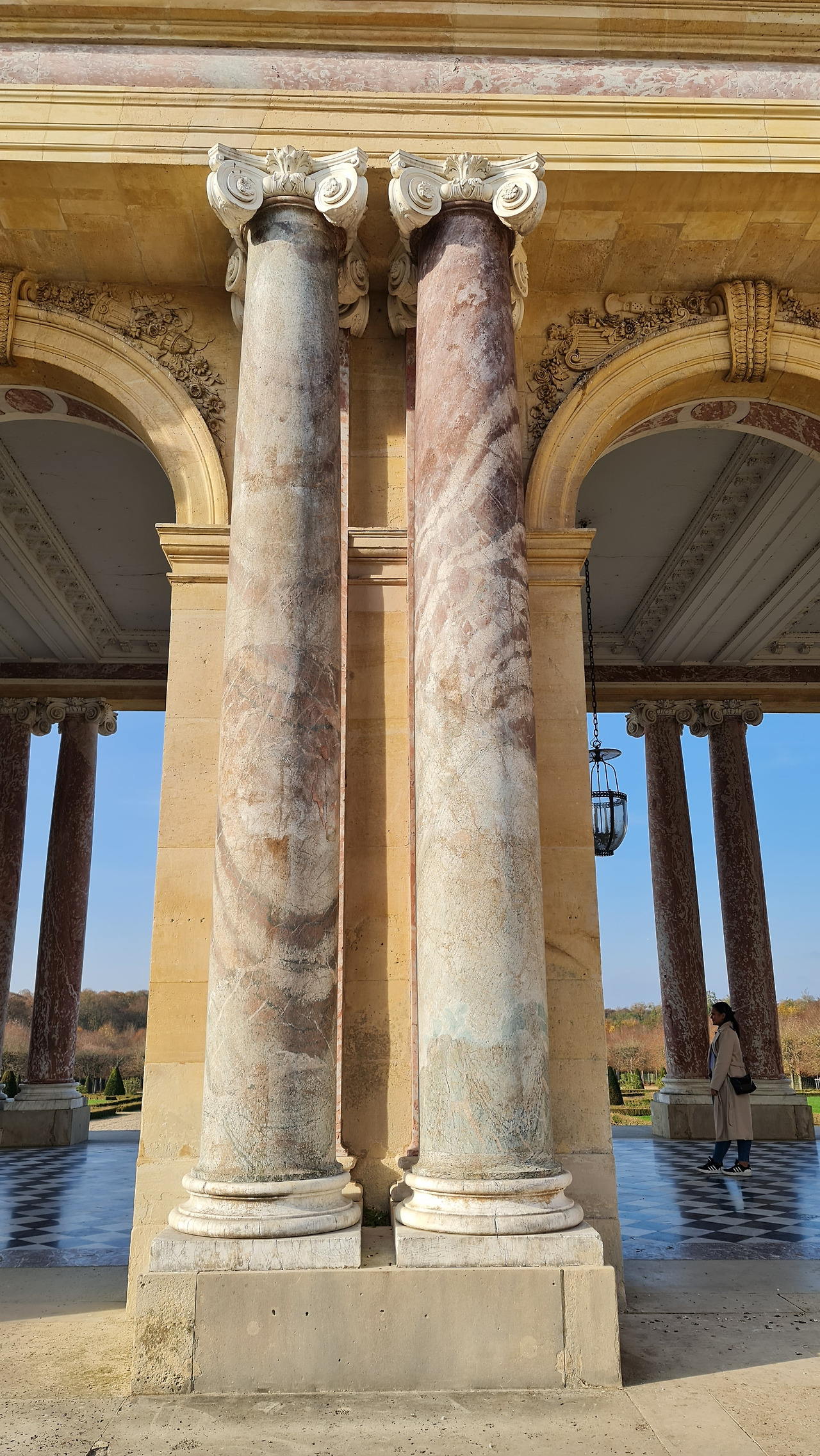 The peristyle is undoubtedly the most iconic element of the Grand Trianon. On the courtyard side, the columns are set in a series of arcades clad in pink marble. The gardens side features a series of twinned columns in green marble flecked with red. The floor, which was originally paved in "compartments of colours", was replaced – it is not known when, exactly by the chequerboard of black and white you see today. These sophisticated materials are in stark contrast to the simplicity of the interior and serve as a reminder that the Trianon was a luxurious palace.