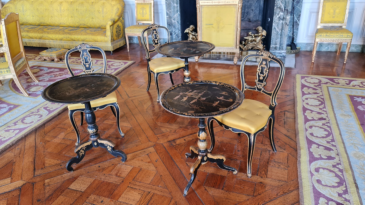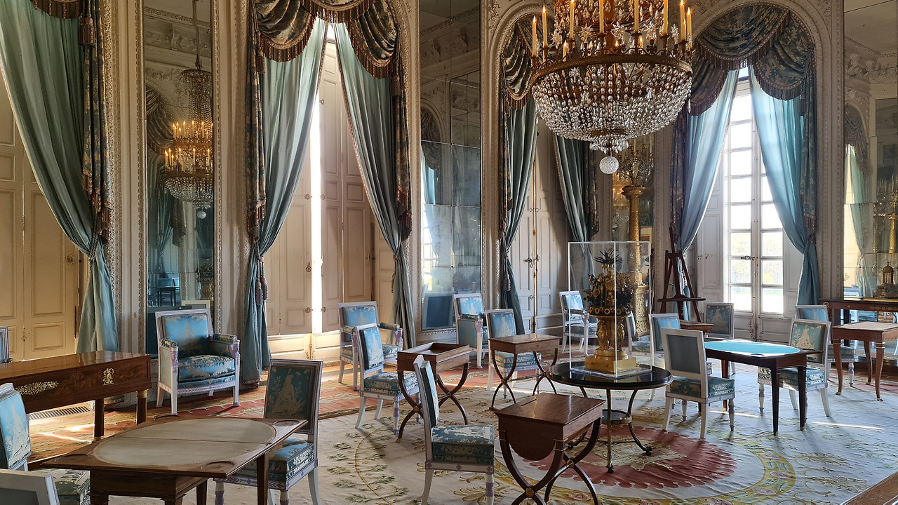 가장 중요한 것은 트리아농에서 모든 가구가 제거되었다는 것입니다. 오늘날 볼 수 있는 물건들은 19세기의 것입니다. 예를 들어, 이 방의 테이블과 의자는 나폴레옹이 1804년부터 1815년까지 프랑스 황제로 있을 때 그의 어머니를 위해 트리아농에 전달되었습니다. 하지만 "마담 메르"로 불린 그녀는 이곳을 좋아하지 않았고, 결국 나폴레옹의 두 번째 아내인 마리 루이즈가 이사를 왔습니다.
