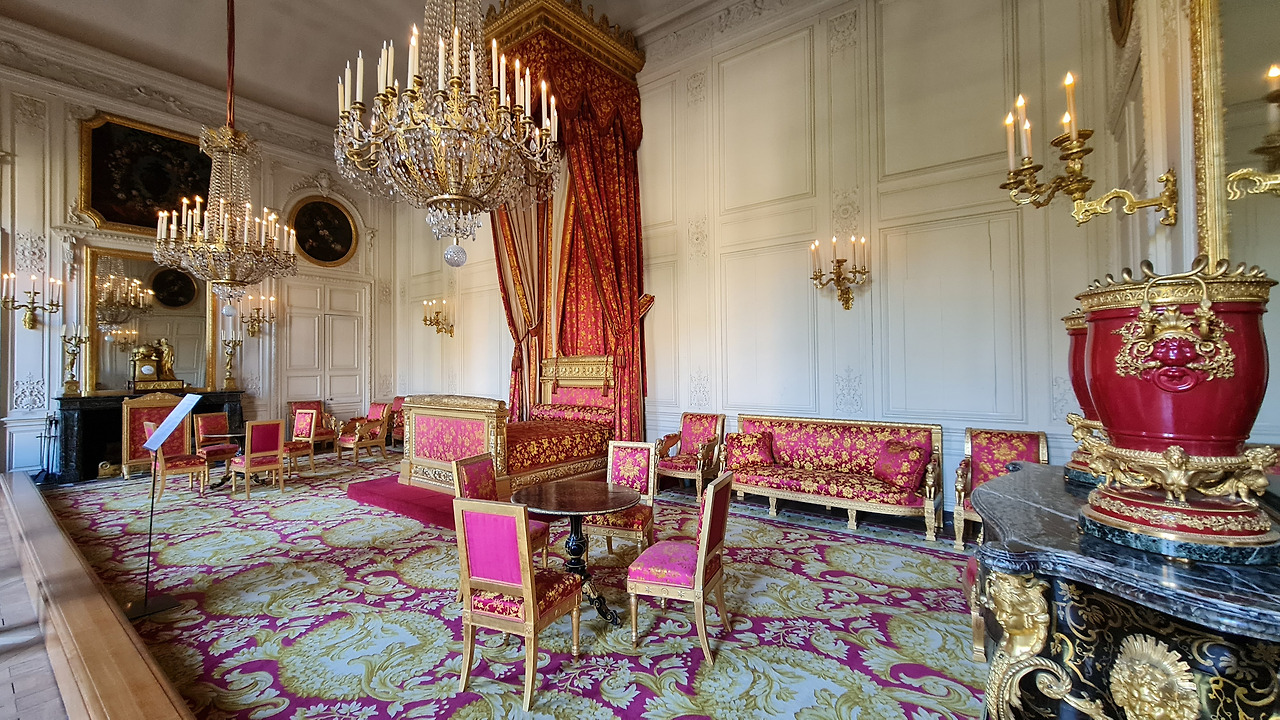 오늘날 이 방에서 전시되는 것은 제국의 화려함입니다. 나폴레옹 시대에는 가장 중요한 방이었습니다. 정교하게 조각되고 장식된 금박 의자, 많은 수의 좌석, 모두 군주에게만 사용되는 진한 붉은색인 진홍색 다마스크로 덮여 있습니다. 이 의례용 조각품은 19세기 초 가장 유명한 캐비닛 제작자인 Jacob-Desmalter가 제작했습니다.