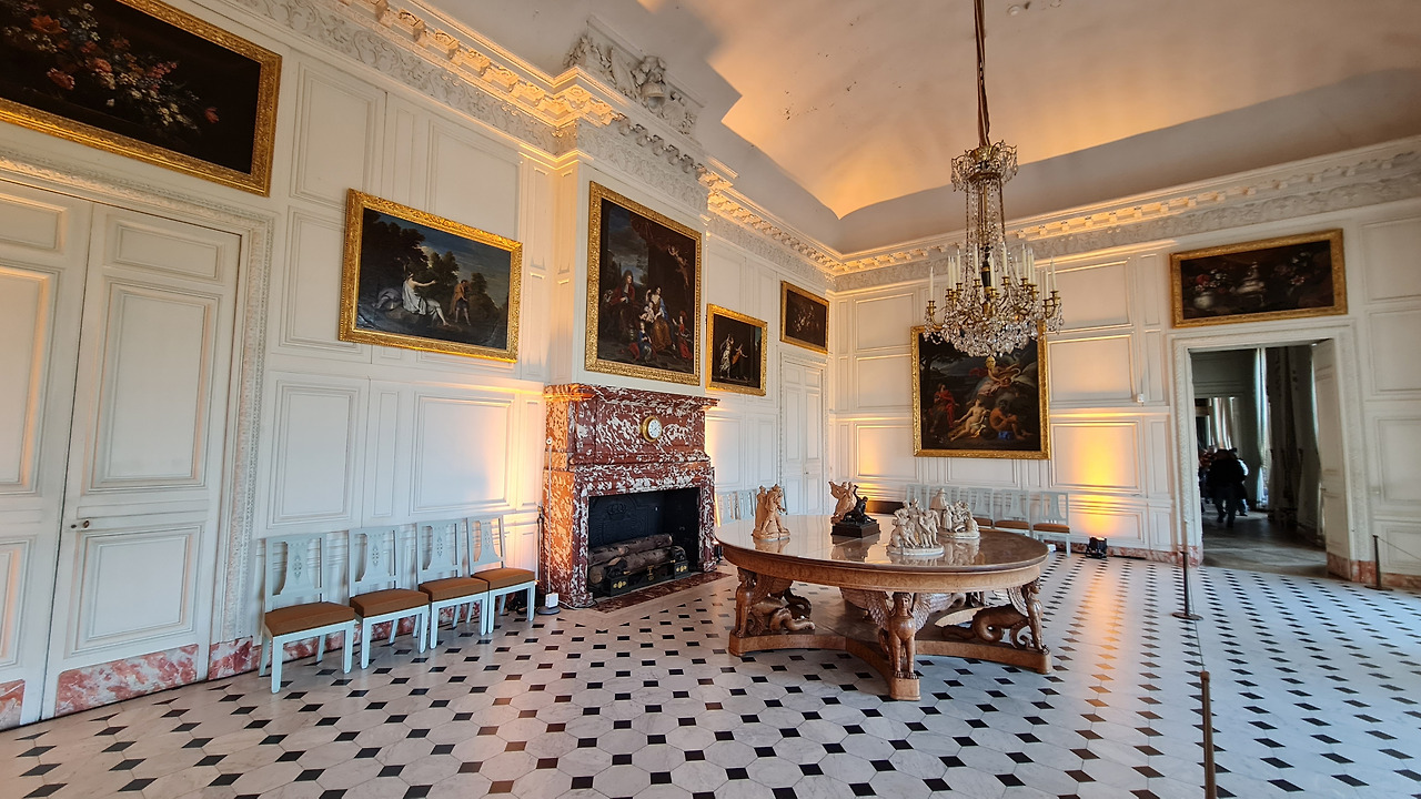 루이 14세의 통치 기간 동안 이 방은 일종의 극장이었으며, 지금은 침실이 된 인접한 방도 포함했습니다. 여기서는 륄리의 발레나 몰리에르의 희곡이 공연되었습니다. 왕립 음악 아카데미나 코메디 프랑세즈의 예술가들이 파리에서 와서 왕과 그의 궁정 앞에서 공연을 했습니다. 나중에 루이 15세 치세에는 게임 룸이었습니다. 식물 모티브가 특징인 섬세한 로코코 스타일의 목공예품은 이 시대에 만들어졌으며, 보라색 브레슈 대리석으로 만든 인상적인 벽난로도 마찬가지입니다.
