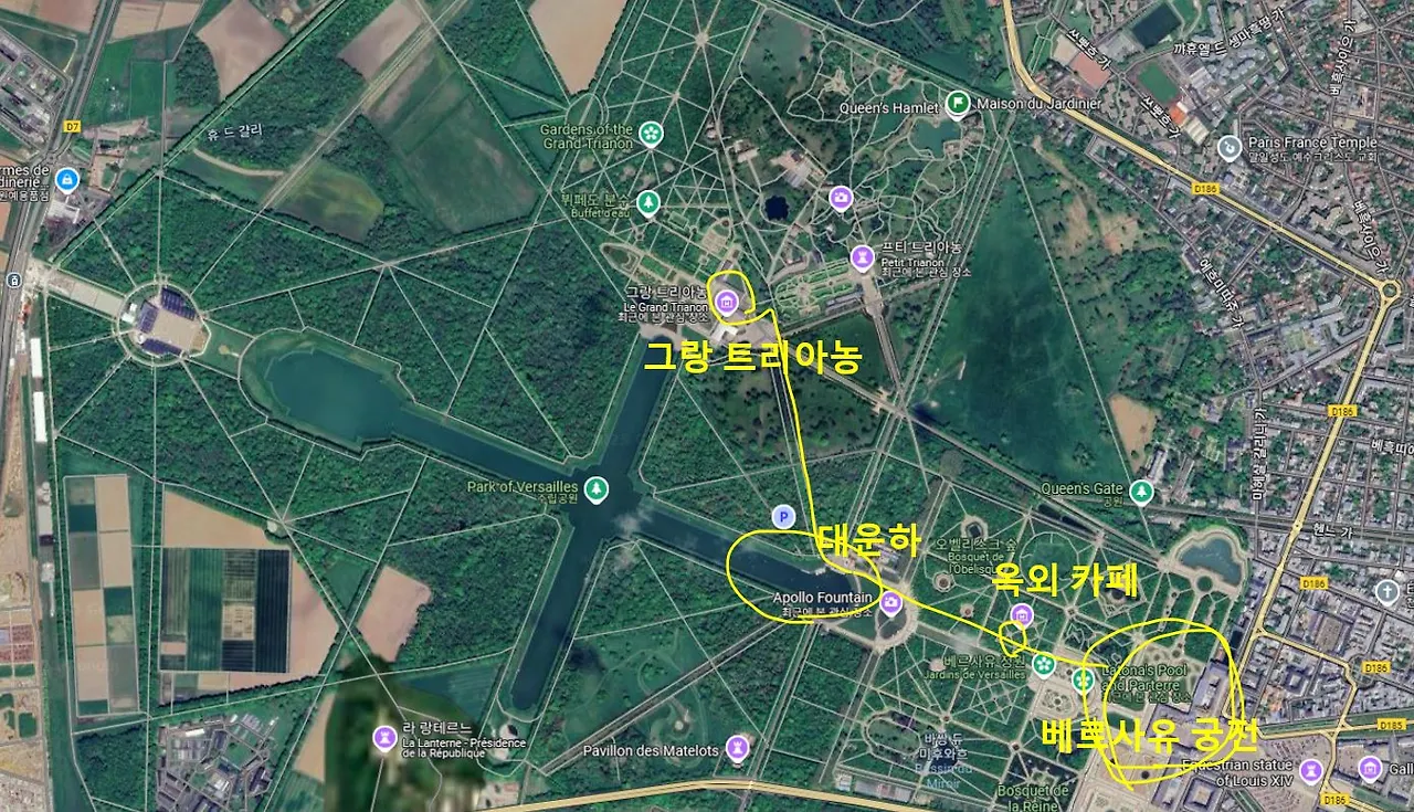 대운하에서 대각선으로 바로 가로질러 700여 m 걸어가면 중간 목적지인 그랑 트리아농(Le Grand Trianon)이 나옵니다. 많이 많이 걸어야 해요 베르사유 궁전은요. 어린이나 노약자 동반하시는 분들께선 괜히 고생시키지 마시고 정원 내 꼬마열차 이용이나 전기카트 임대 고려해 보세요. 왕복 고려하면 궁전 안에서만 수 km 걸어야 합니다.
