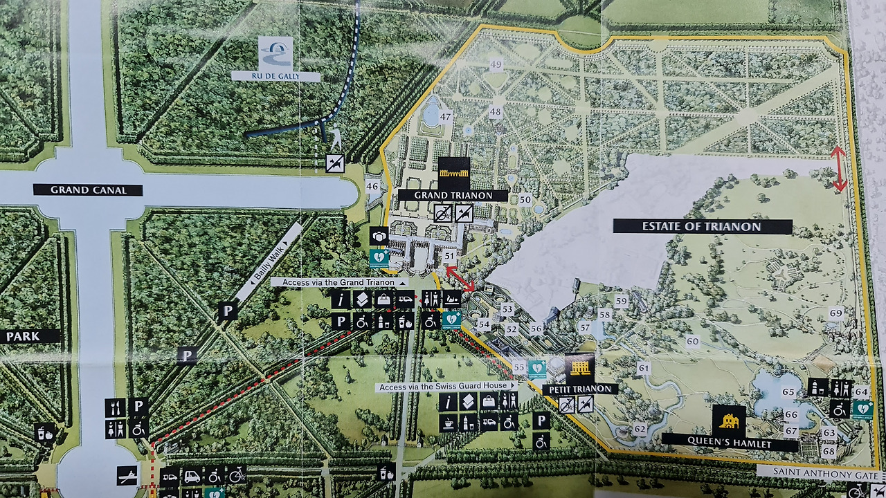 그랑 트리아농과 쁘띠 트리아농을 연결하는 정원길은 유료입장이라 외부하고 단절되어 있어서 그렇대요. 다시 보안수속 밟고 그랑 트리아농으로 들어와서 정원 쪽으로 돌아가면 아래 지도에 빨간 화살표 된 곳을 지날 수 있다고 알려줍니다.