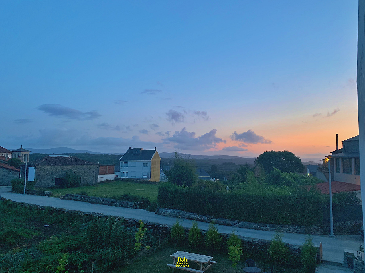 그렇게 오후를 보내고 우린 알베르게의 옥상에서 지는 노을을 보며 하루의 여담을 나누고 있었는데, 밑에서 덜그럭 거리는 소리에 쳐다보니 알베르게의 마당에 텐트를 치는 커플의 모습이다. 늦은 시간에 도착해 알베르게에 자리가 없거나 텐트를 들고 다니는 순례객들이 있다고 이야기만 들었지 실제로 보기는 처음이었다.