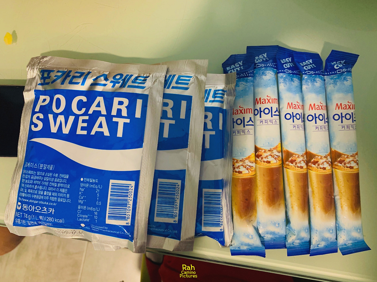 알베르게를 잡고 한 한국인 형님을 만났다. 띠용…!!! 함께 식사를 나눠먹고 나니 이런 소중한 아이템을 나눠주셨다. 어쩌면 정말 흔하디 흔한 제품들이지만 걸음을 시작하기 전에 미처 생각하지 못했던 분말 포카리와 아이스커피 믹스