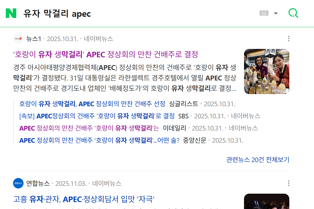 그런데 이 막걸리, 2025년 우리 술품평회에서 저도수 탁주 부문 대상을 수상 받는다. 같은 양조장에서 6년 만에 또 대상을 받아버리는 일이 발생한다. 그리고 이 수상 덕분에 APEC 정상회의 만찬 건배주로 발탁된다. 원래 국제 정상회의 건배주는 와인이나 약주 같은 맑은술이 관례였는데 이번에는 막걸리가 올라갔다.