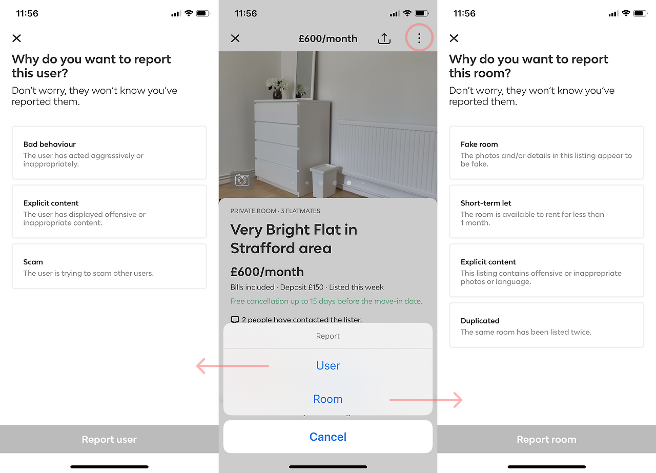 더보기를 클릭하기 신고를 할 수 있는 기능이 뜨고, 방을 올린 사람, 방 자체를 개별적으로 신고 가능한 점이 주요 특징이다. 보통 신고 기능을 살펴보면 해당 상품과 작성자 구분 없이 단순 신고 하나로 묶는 경우가 많은데 Badi는 둘을 분류하여 상세적으로 신고 가능하며, 적절한 항목들을 리스트화 하여 신고 이유를 정확하게 선택 가능하다.