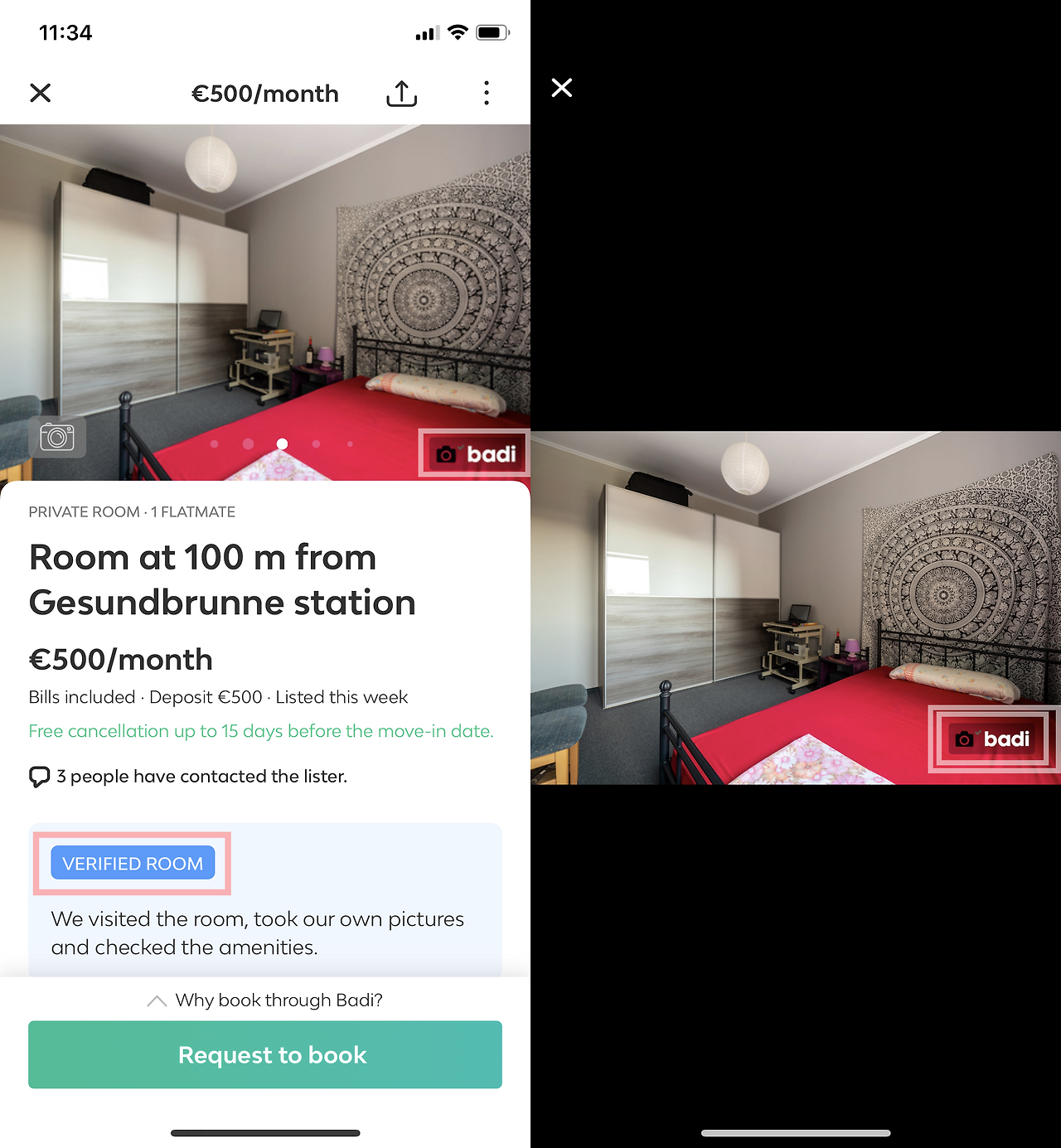 Badi는 이러한 문제를 해결하기 위해 의뢰인이 Badi에 요구하고, Badi는 직접 방을 방문하여 사진과 동일한지 검증 절차를 걸쳐 검증이 통과된 방에 'verified room'과 'badi'에서 직접 찍은 사진임을 표시한다. 만약 'Verified Room'이라는 배지만 보여 주었으면 사용자는 어떻게 검증된 방이지?라는 혼란이 올 수 도 있지만 이점을 방지하기 위해 하단 부분에 어떤 식으로 검증된 방인지 부연 설명을 통해 보여주어 사용자에게 정확한 정보를 알려준다.