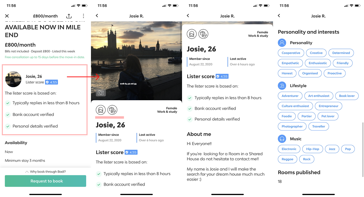 인공지능(AI)을 활용하여 예비 플랫 메이트들과 방을 연결해준다. 가격과 위치뿐 아니라 자신이 설정한 연령 라이프스타일, 관심사에 맞게 Badi는 연관성 있는 집들을 우선순위로 보여주고, 자신의 성격과 맞는 사람을 우선 적으로 찾을 수 있도록 도와준다. 직접 집을 보기 전에 앱을 통해 집에 대한 분위기를 경험할 수 있어 맘에 드는 집을 찾기까지 낭비되는 시간들을 어느 정도 막아준다.