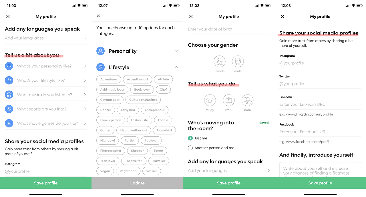 같이 사는 사람들에 대한 정보를 사전에 알고 싶어 하는 서비스인 만큼 자신의 개성과 성격을 나타낼 수 있게 나의 프로필 작성이 가능하다.