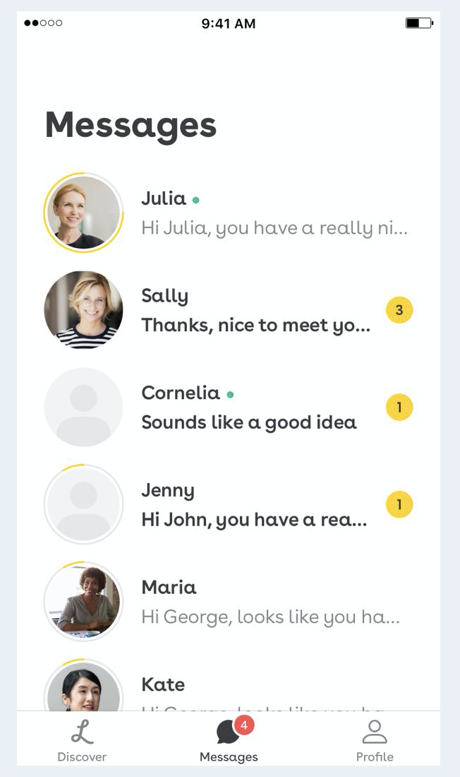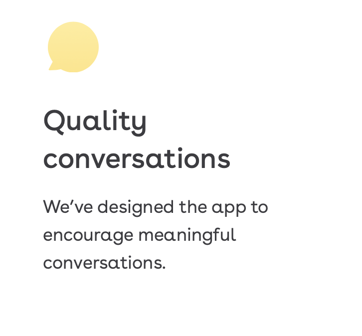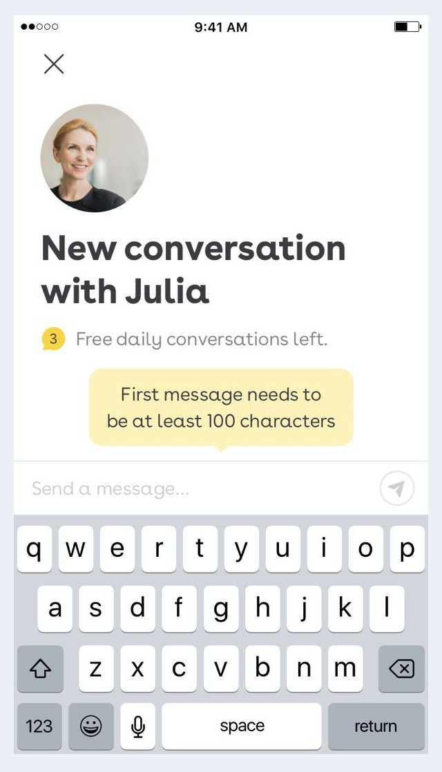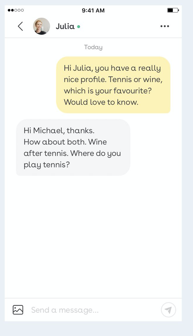 상대방에게 보내는 첫 메시지는 최소 100자이어야 한다. '안녕' '반갑습니다'와 같은 가벼운 인사 대신 '안녕하세요. 사진이 너무 좋네요. 와인이 좋아요 테니스가 좋아요? 뭐가 더 좋을까요?'와 같이 정성 가득한 멘트로 시작해야 한다. 또한 스팸성 대화를 줄이기 위해, 하루 보낼 수 있는 대화 메시지를 제한하고 있다. 또한 상대로부터 답장이 없다면 72시간 이후 메시지는 자동으로 사라진다. 이러한 기능을 통해 불필요한 매칭을 제한하고, 매칭 수가 아닌 대화 품질을 중요시한다.