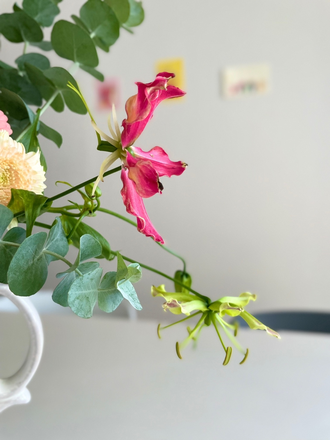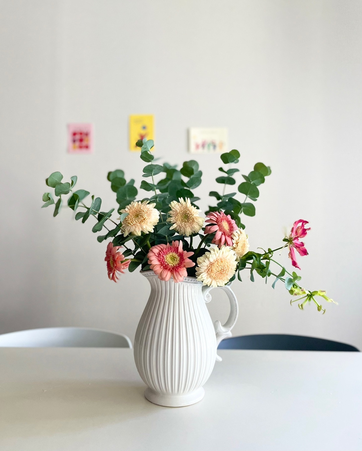 다시 사랑스러운 화병이 완성되었어요. 어느 꽃 농부의 손길을 거쳐 우리 집으로 온 거베라와 이웃 언니의 작은 화분에서 시작해 정원에 뿌리를 내리고 가지를 낸 유칼립투스, 꽃을 산 도매 농장 사장님께서 직접 기른 글로리오사 한 가지까지 꽃마다 그들의 이야기를 간직하며 화병에 모여 있지요. 식구들이 가장 많이 모이는 식탁에 자리를 잡으면 꽃이 주는 기쁨을 즐기기에 충분해요.
