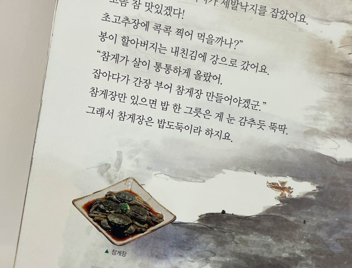 미서는 "아, 맞네!"라며 웃습니다. 다른 어린이들도 밥도둑이라는 말에 휴, 긴장을 풀고 다시 책을 읽기 시작했어요. 밥도둑은 '입맛을 돋우어 밥을 많이 먹게 하는 반찬 종류를 비유적으로 이르는 말'(출처: 네이버)입니다. 도둑밥은 '돈을 내지 않고 몰래 먹는 밥'(출처: 네이버)을 말합니다. 참게장은 밥도둑입니다. 그런데 미서가 ‘밥’과 ‘도둑’의 위치를 바꾸어 읽었더니 다른 낱말이 되었습니다. 양념게장을 좋아한다는 미서가 화들짝 놀라게 말이죠. 저는 궁금한 것은 물어보고 확인하는 미서의 이런 태도가 참 좋습니다. 사심을 담아보자면 아주 귀엽고 사랑스럽습니다. 미서가 아니었다면 밥도둑과 도둑밥을 정의해 볼 일이나 있었겠어요?