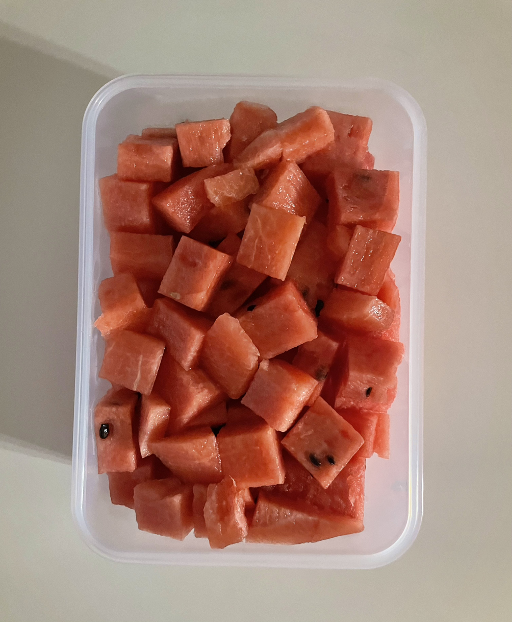 먼저 수박을 반으로 가르고, 껍질을 흰 부분을 정리해 줍니다. 그리고 댕강댕강 깍둑 썰어 보관 용기에 가득 담아주지요. 별 일은 아니지만 껍질이 가득 쌓이는 지금 이 순간도 저는 수박이 싫습니다. 수박이 싫은데 춘기가 제일 좋아하는 과일이라 내색을 못하다가 마침 춘기가 방에 문을 닫고 있는 관계로 수박에게 본심을 전해봅니다.