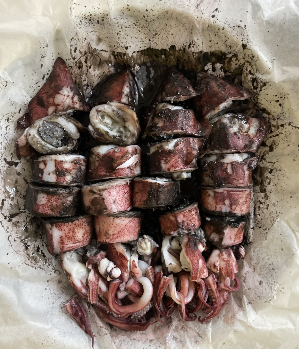 한치 먹물찜은 씻지 않고 그대로 찌면 됩니다. 그래도 집에서는 조금 편하게 먹고 싶어서 뼈만 빼고 찌려고 했는데, 뼈만 쏙 빼려니 손이 익숙하지 않습니다. 먹물이 흘러나오길래 그만 포기하고 얼른 찌기로 했습니다. 예전에는 어떻게 했는지 모르겠습니다.