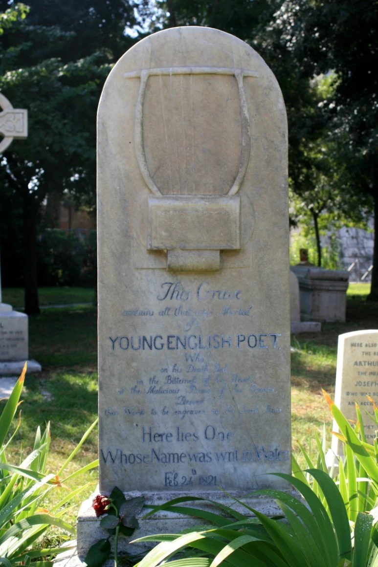 "이 묘에는 영국의 젊은 시인의 유해가 묻혀 있다. 죽음의 자리에서 고국 사람들의 무심함에 극도로 고뇌하던 그는 묘비에 이런 말이 새겨지기를 원했다. '여기 물 위에 이름을 새긴 사람이 누워 있노라."