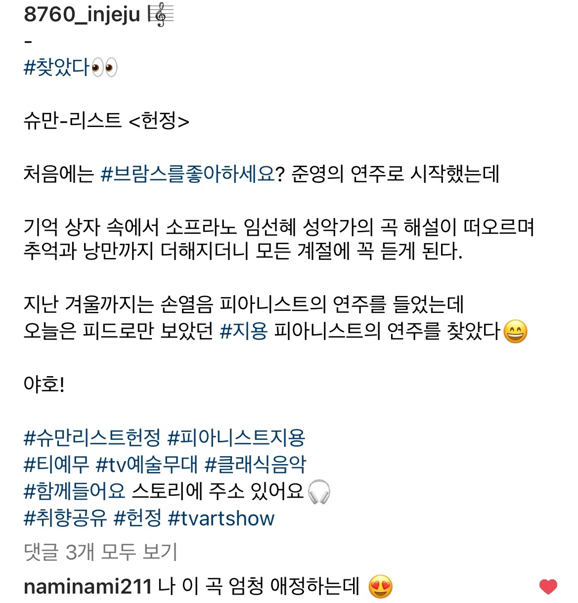 그래서 이 느낌을 기록해 두고 싶었어요. 저에게는 '지용'이라는 연주자의 이름과 '헌정'이라는 연주곡의 이름만 있어도 그 안에 담긴 감동과 행동이 살아나지만 그래도 기억이 언제까지 계속될지는 모르잖아요. 그래서 몇 문장을 더 적어 인스타그램 피드글을 작성했지요.