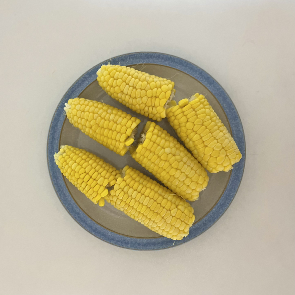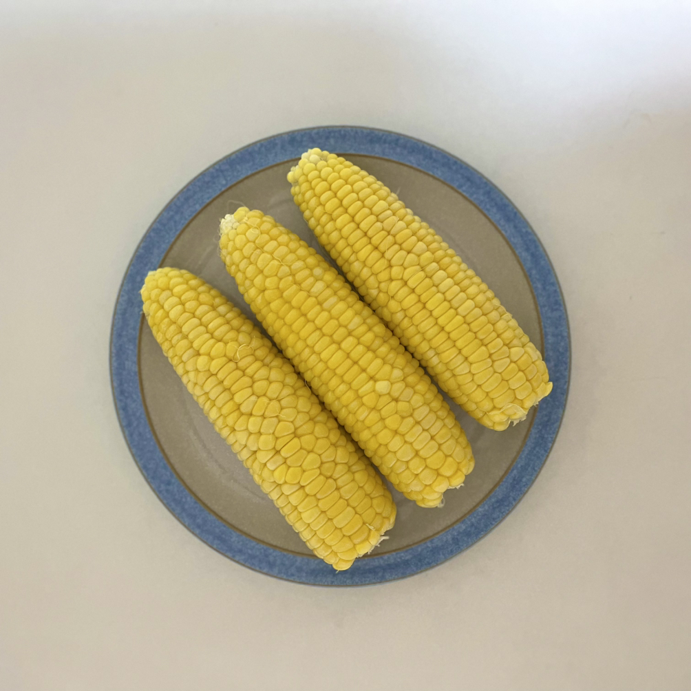 옥수수 세 개, 전자레인지 넣고 5분, 뒤집어서 다시 5분.