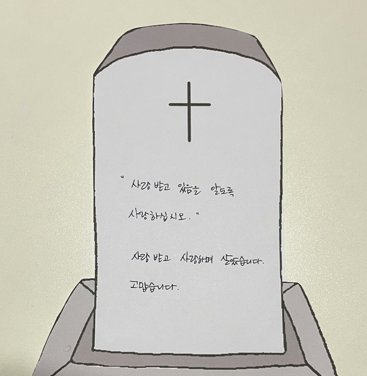 먼저 '부활의 신앙'을 가진 성당 교우들과의 '묘비명(墓碑命) 작성하기'를 한 이야기부터 해볼게요. 영화 <인사이드 아웃 2>의 표현을 빌리자면 ‘자아'가 형성되는 시기에 저는 마음 깊이 각인될 죽음을 보았고, 스무 살이 되어서는 안타까운 죽음을 가까이에서 여러 번 보았기에 죽음에 대해서는 어느 정도의 정의가 내려져 있다고 생각했어요. 그런데 계획에는 없던 묘비명을 적으려고 하니 머릿속에 먹구름이 가라앉더라고요. 그래서 요 며칠 째 아침마다 떠오르는 문장을 묘비명에 새기기로 결정했습니다.