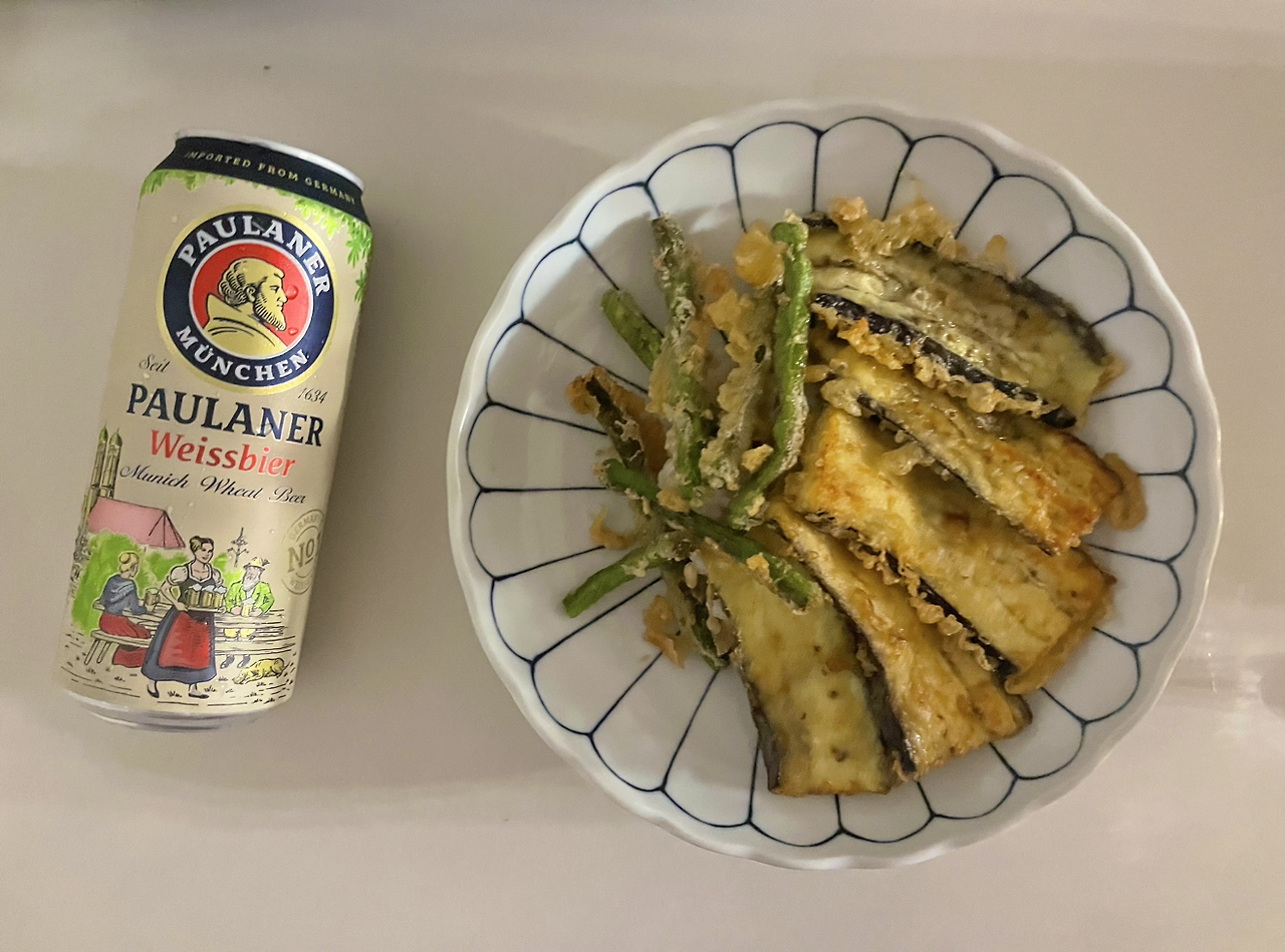 좋아하는 맥주를 하나 꺼내오니 진정한 완성이네요. 역시! 가지튀김은 언제나 맛있어요. 돼지고기나 쇠고기를 갈아 가지 사이에 샌드위치처럼 넣어 튀겨도 맛있지만 그냥 가지만 튀겨도 정말 맛있어요. 버섯탕수육을 처음 먹었을 때 '유레카!'를 외쳤는데, 가지튀김도 비슷합니다. 기대하지 않았지만 '나, 이런 맛을 좋아하는구나!'라는 사실을 깨닫게 되죠. 게다가 그린빈 튀김도 찰떡궁합이네요. 가지튀김이 살짝 느끼해질 무렵에 그린빈 튀김을 하나 먹으면 입가심이 되는 것 같아요. 튀김에게 이런 표현은 정말 거짓말이겠지만, 개운해지는 느낌이라면 이 둘의 궁합을 짐작하실 수 있을까요?