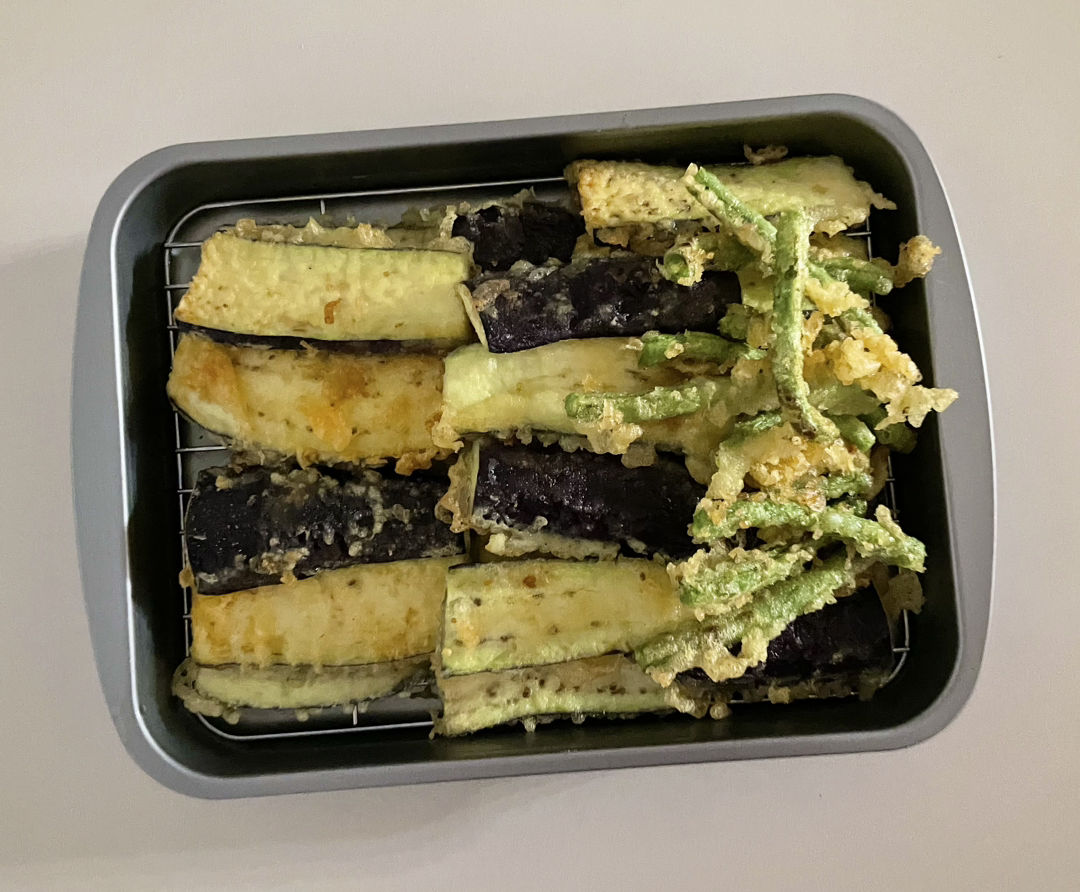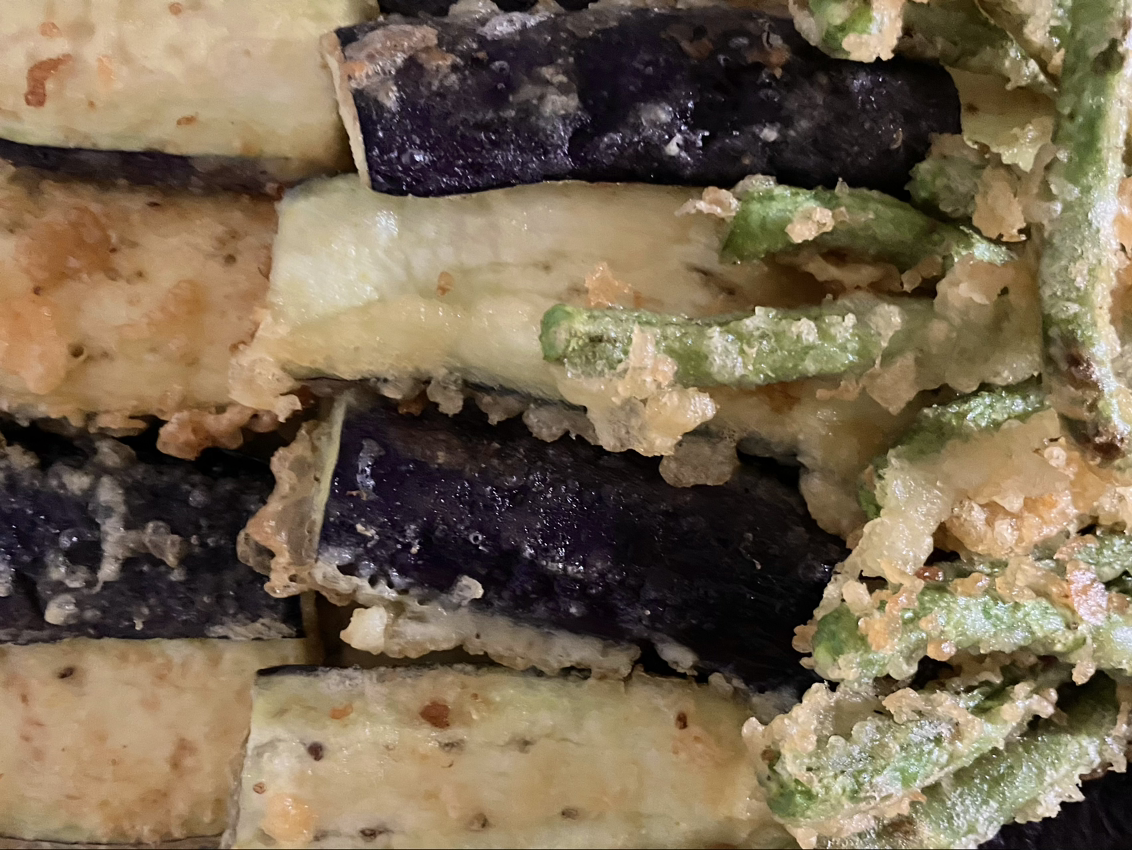 가지가 80% 정도 익으면 튀김기에서 꺼내 망이 있는 트레이나 키친타월을 깔고 그 위에 건져 놓습니다. 가지튀김에게 휴식시간을 주어 재료가 완전히 익도록 그대로 두었다가 먹기 직전에 한 번 더 튀겨줬어요. 두 번째에도 기름을 서서히 달궈 튀김 온도에 다다르면 가지 튀김을 넣어 살짝(1분 정도)만 더 튀겨줍니다. 이때는 수분이 날리면서 기름이 사방팔방으로 마구 튈 수 있어요. 또 조심해야 해요. 아, 다 튀기고 나니 가지를 평소대로 썰 걸, 예쁘지 않아 아쉽네요. 그래도 입에 들어가면 소화되는 것은 똑같으니까 괜찮아요. 저는 냉장고에 그린빈이 있어서 그것도 함께 튀겼어요.