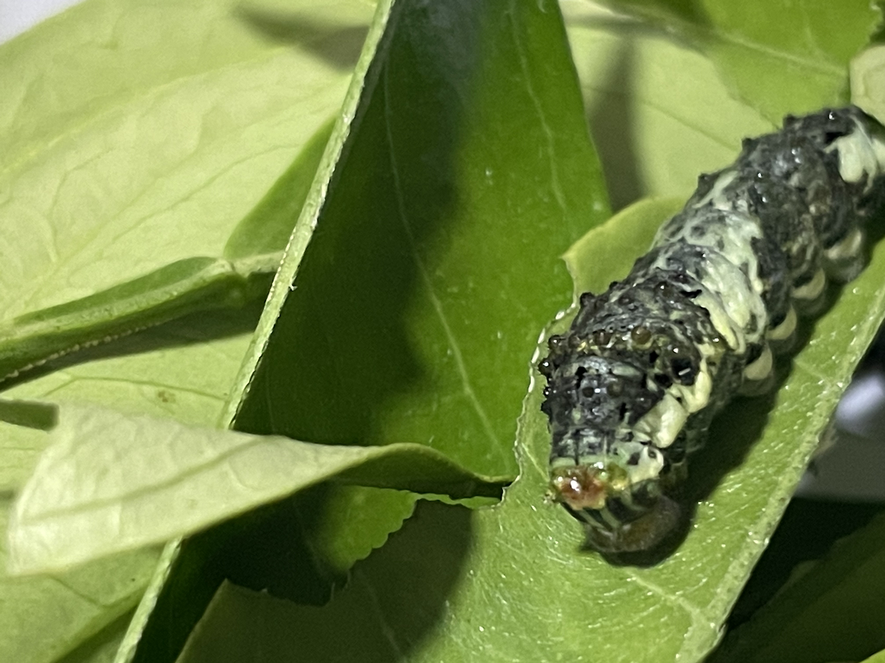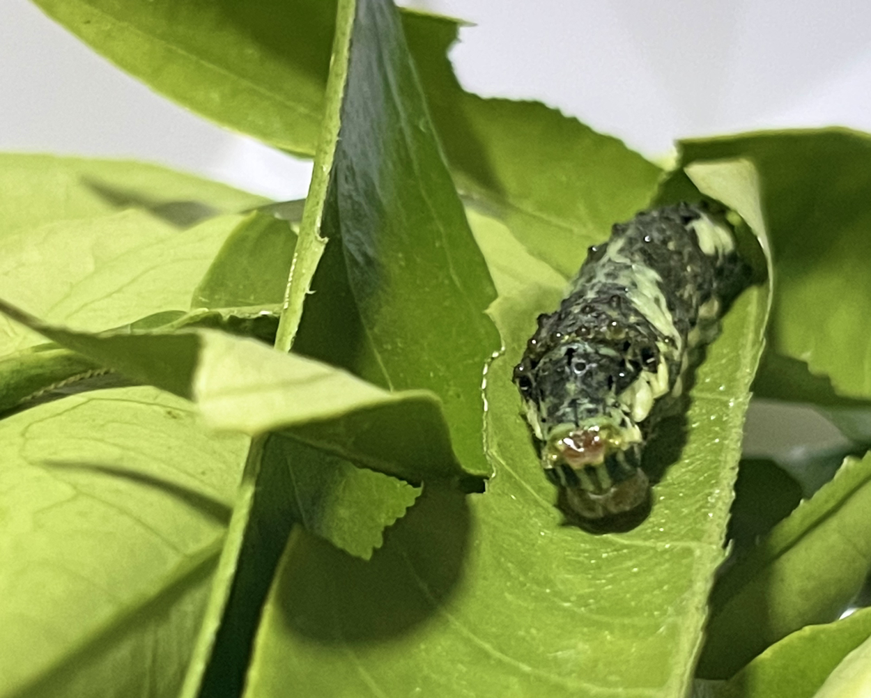 물론 길 걷다가 날아가는 새의 똥을 맞아본 적이 있는 저는 새똥을 닮았다는 말에 전혀 동의할 수가 없지요. 새똥처럼 퍼지지 않고 탱글탱글한 몸매에 보드라운 감촉을 가진 호랑나비 애벌레가 새똥보다 훨씬 예쁘지요. 게다가 만약 새똥을 닮았다면 청도의 한 카페 마당에서 이 애벌레와 처음 마주쳤을 때 반가운 탄성을 지르진 않았겠죠. 저에게는 새똥이 아니라 그저 거무튀튀한 애벌레일 뿐이지요. 작아진 허물을 벗을 때마다 얼른 먹어치우며 흔적을 없앨 줄도 아는 영리한 애벌레이고요.